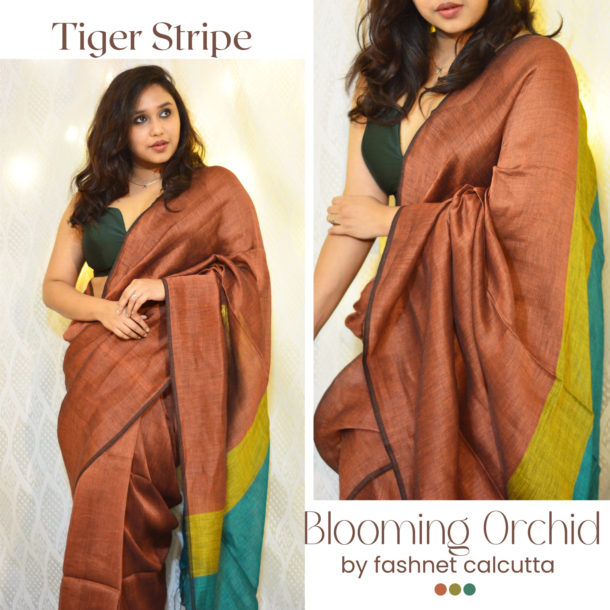 Drape yourself in power, passion, and raw sensuality with Tiger Stripe from our Blooming Orchid range. This cotton by linen beauty is woven on a striking black base, bringing out the fiery essence of its rusty orange body—a shade that embodies untamed energy and irresistible charm.