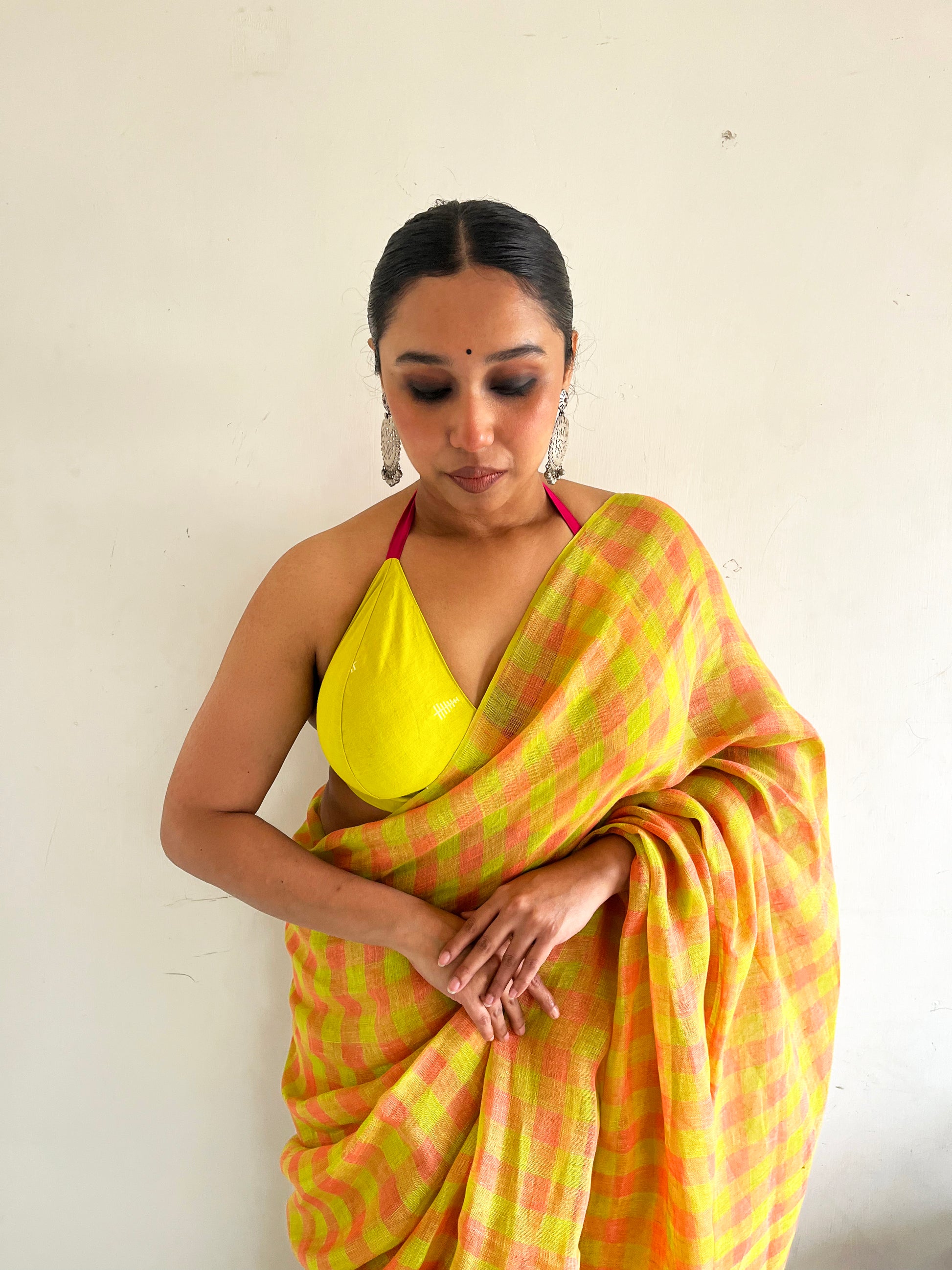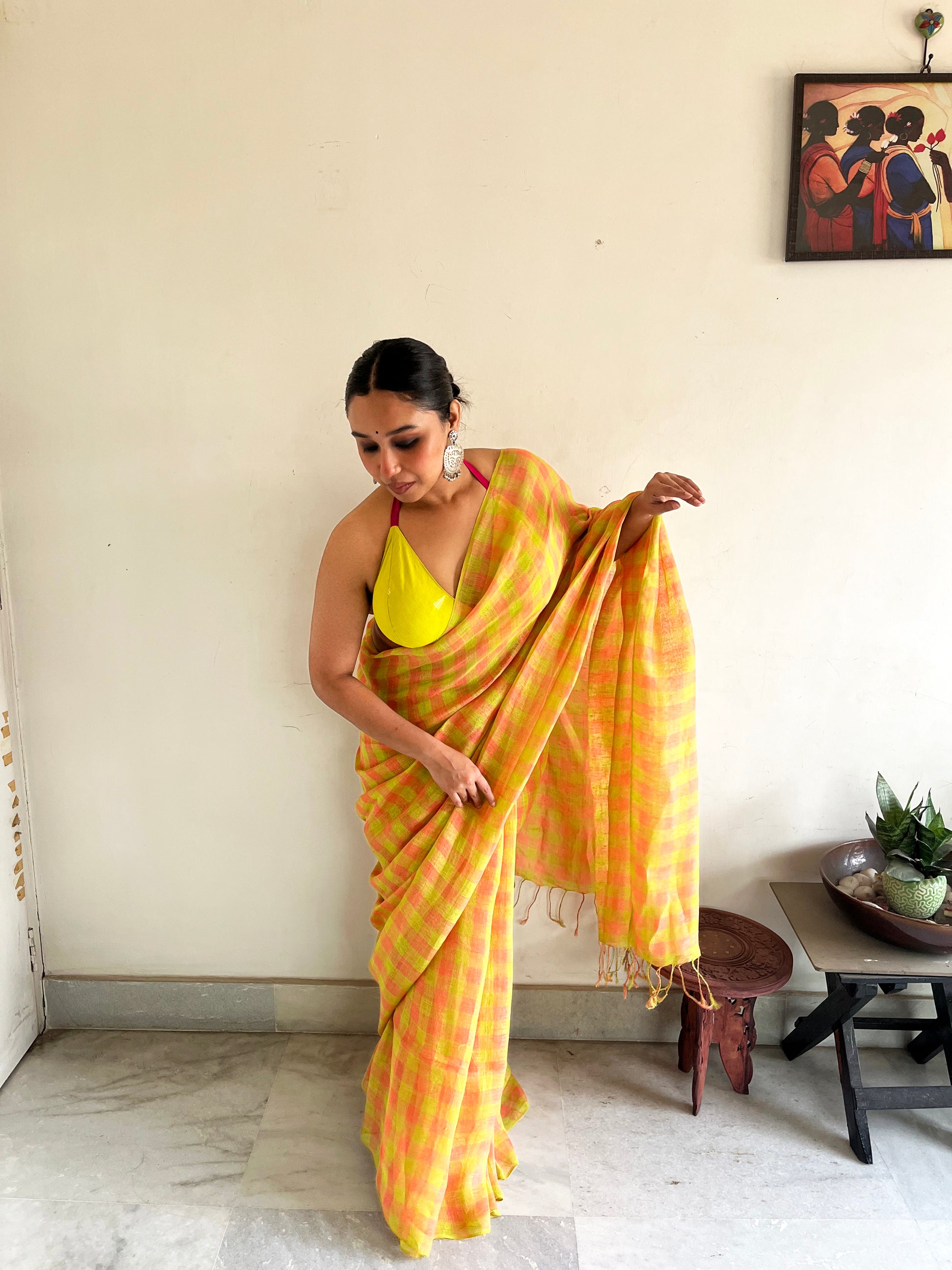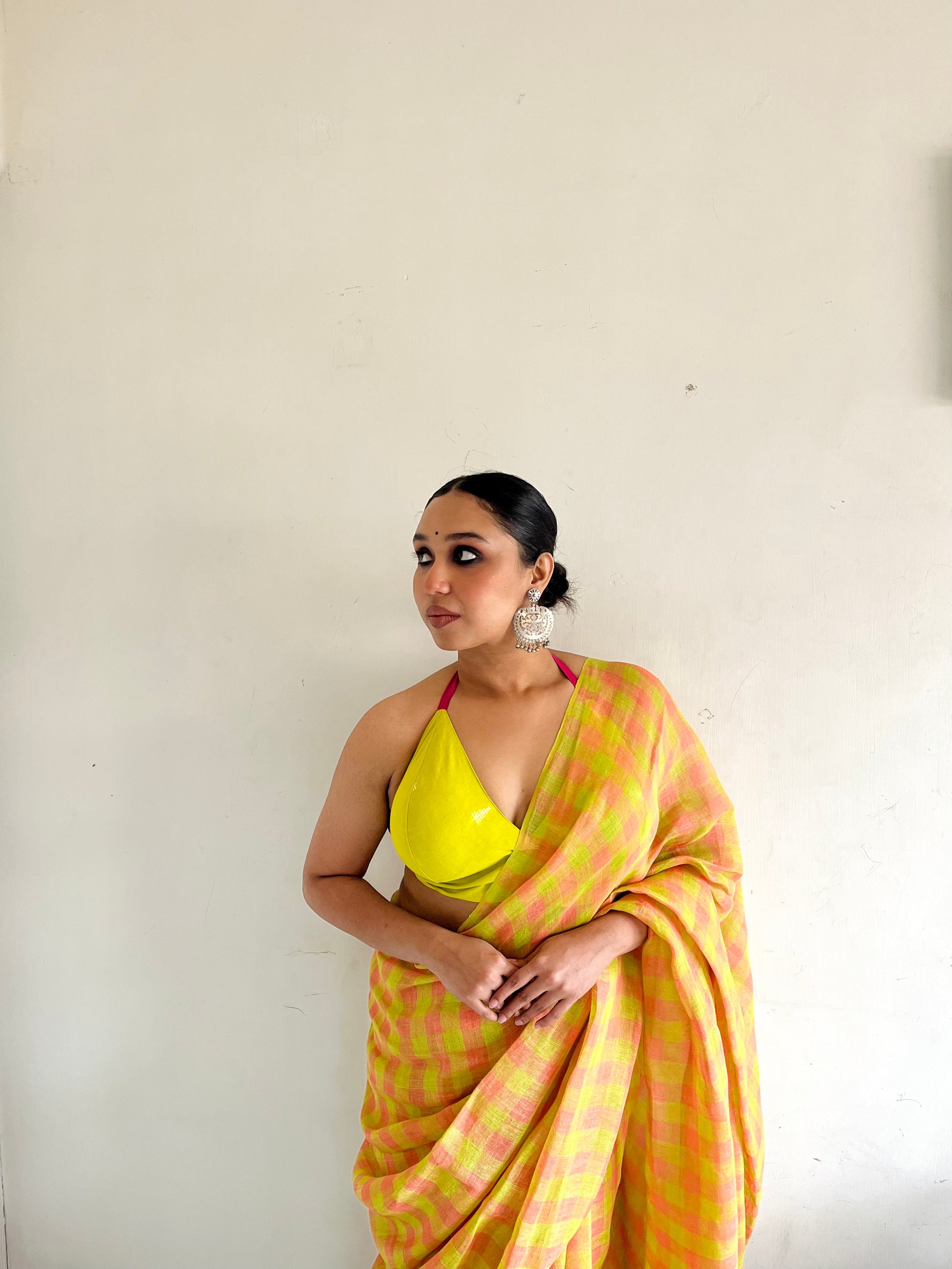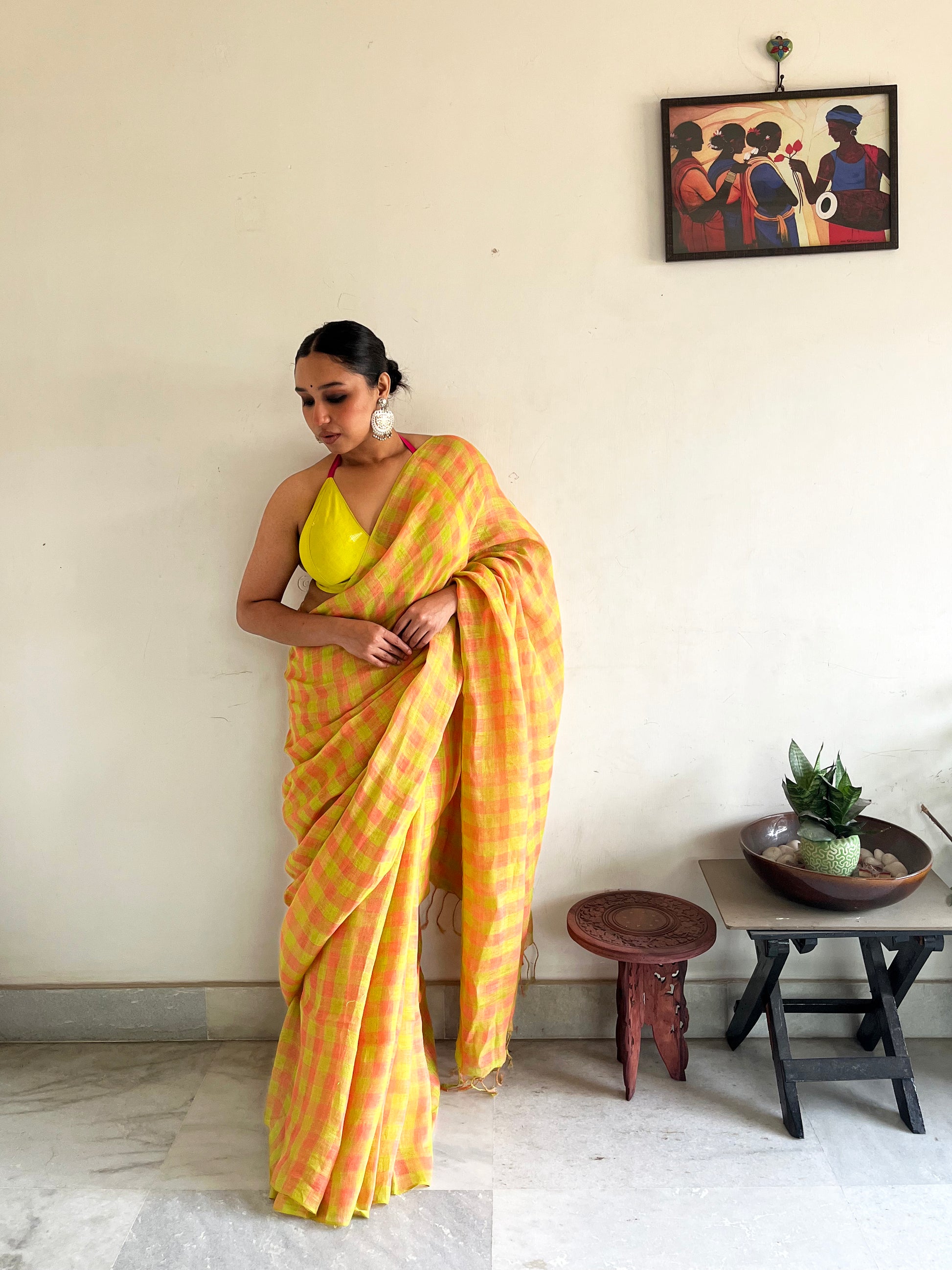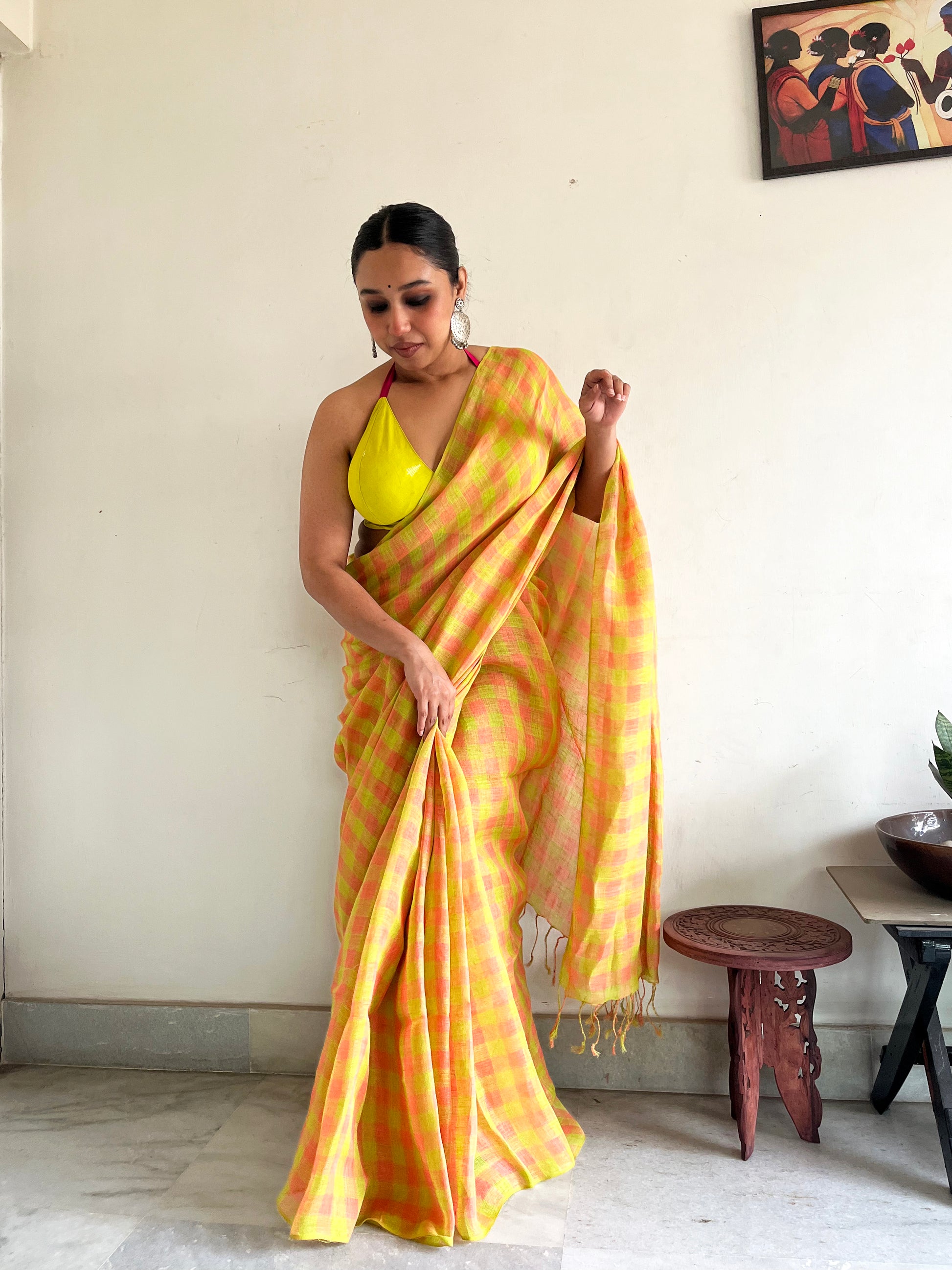 The geometry tempers the vibrancy, ensuring the saree feels structured rather than chaotic. The small checks create rhythm. The colours create attitude.
