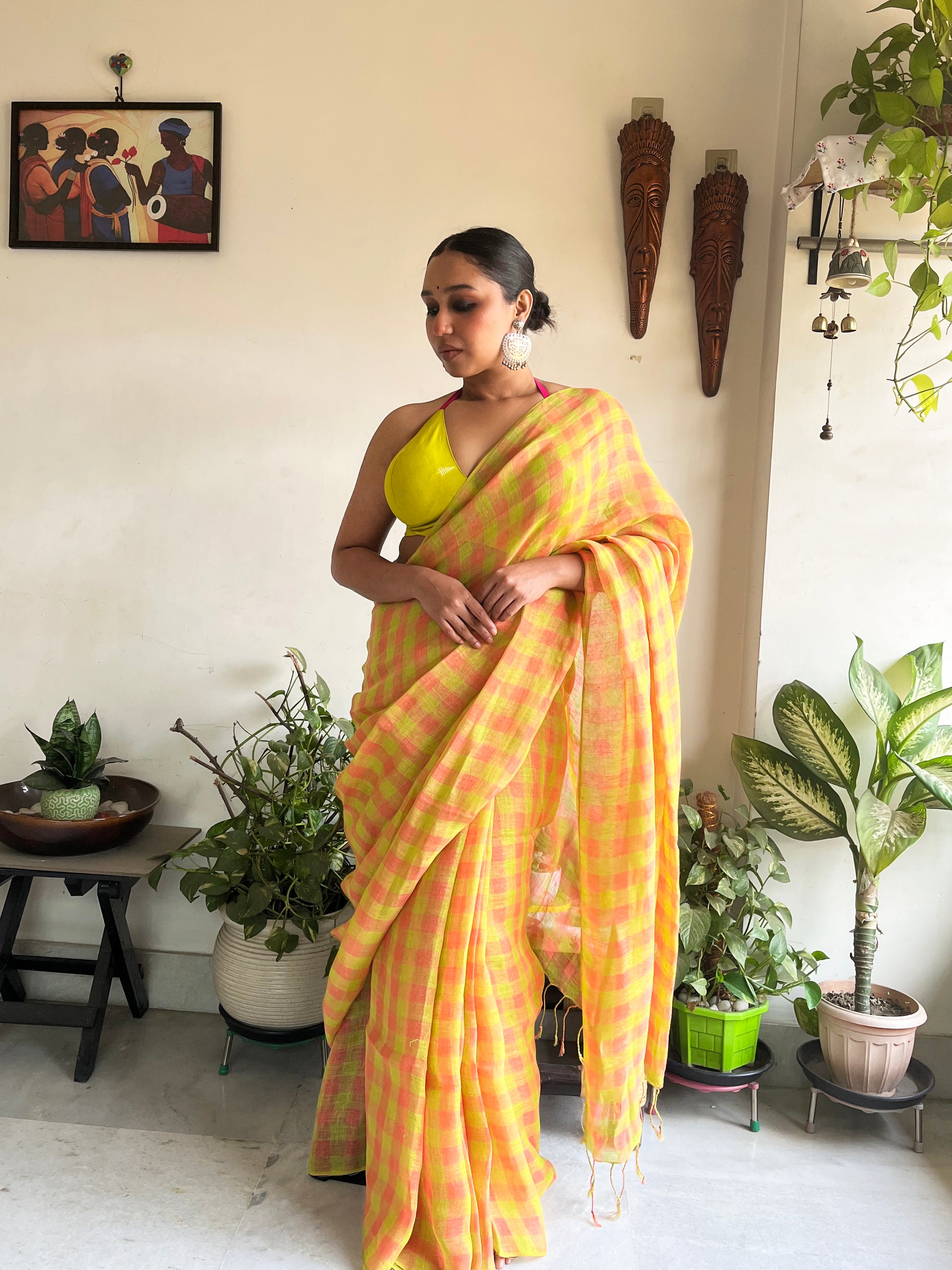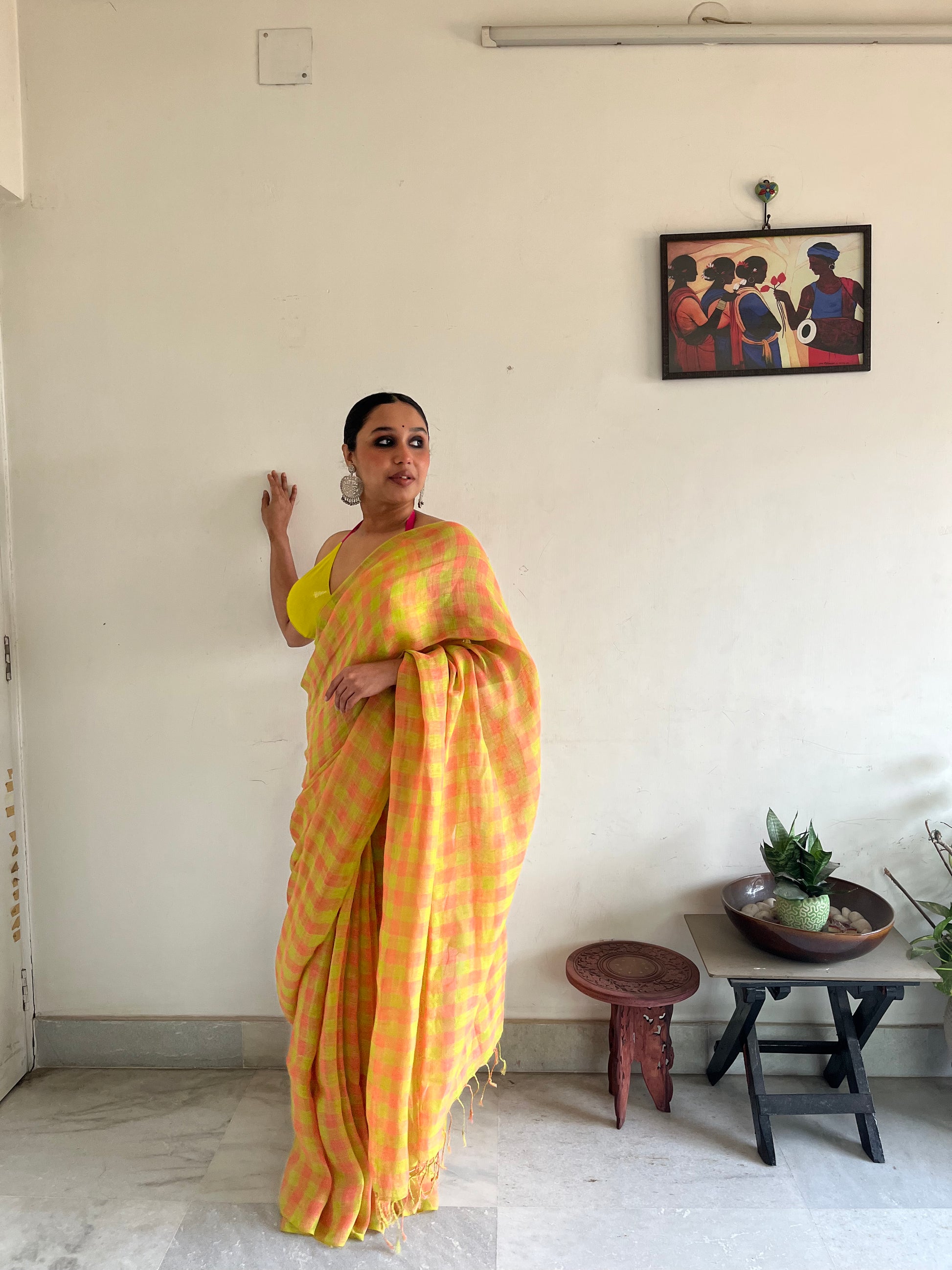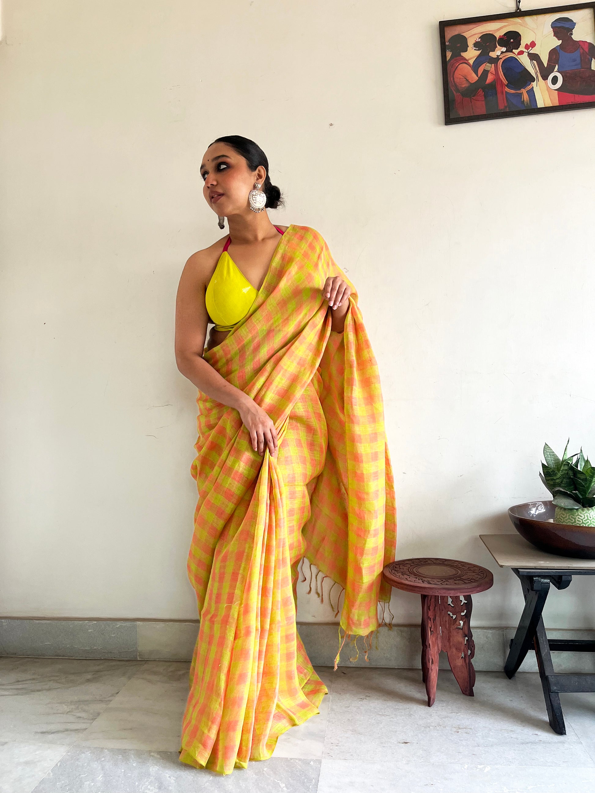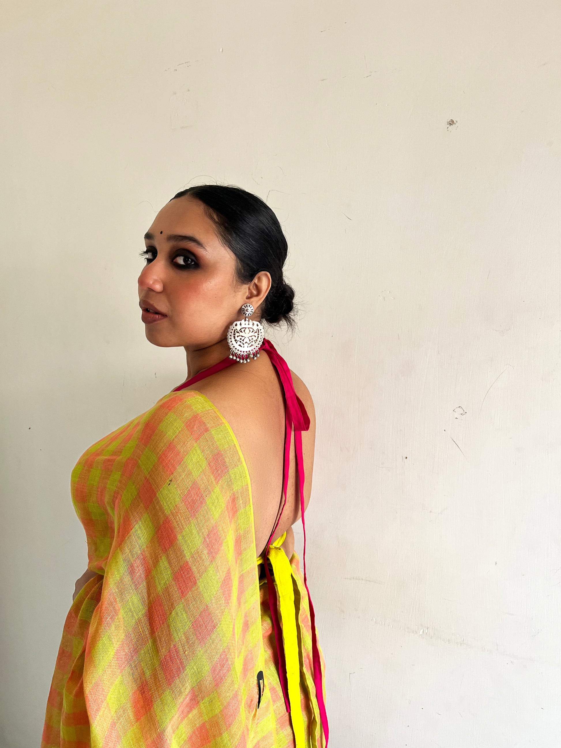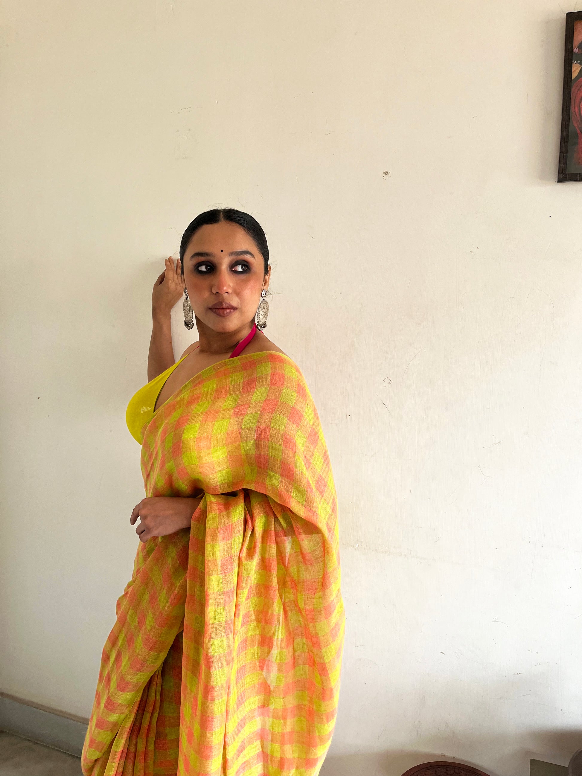 The geometry tempers the vibrancy, ensuring the saree feels structured rather than chaotic. The small checks create rhythm. The colours create attitude.