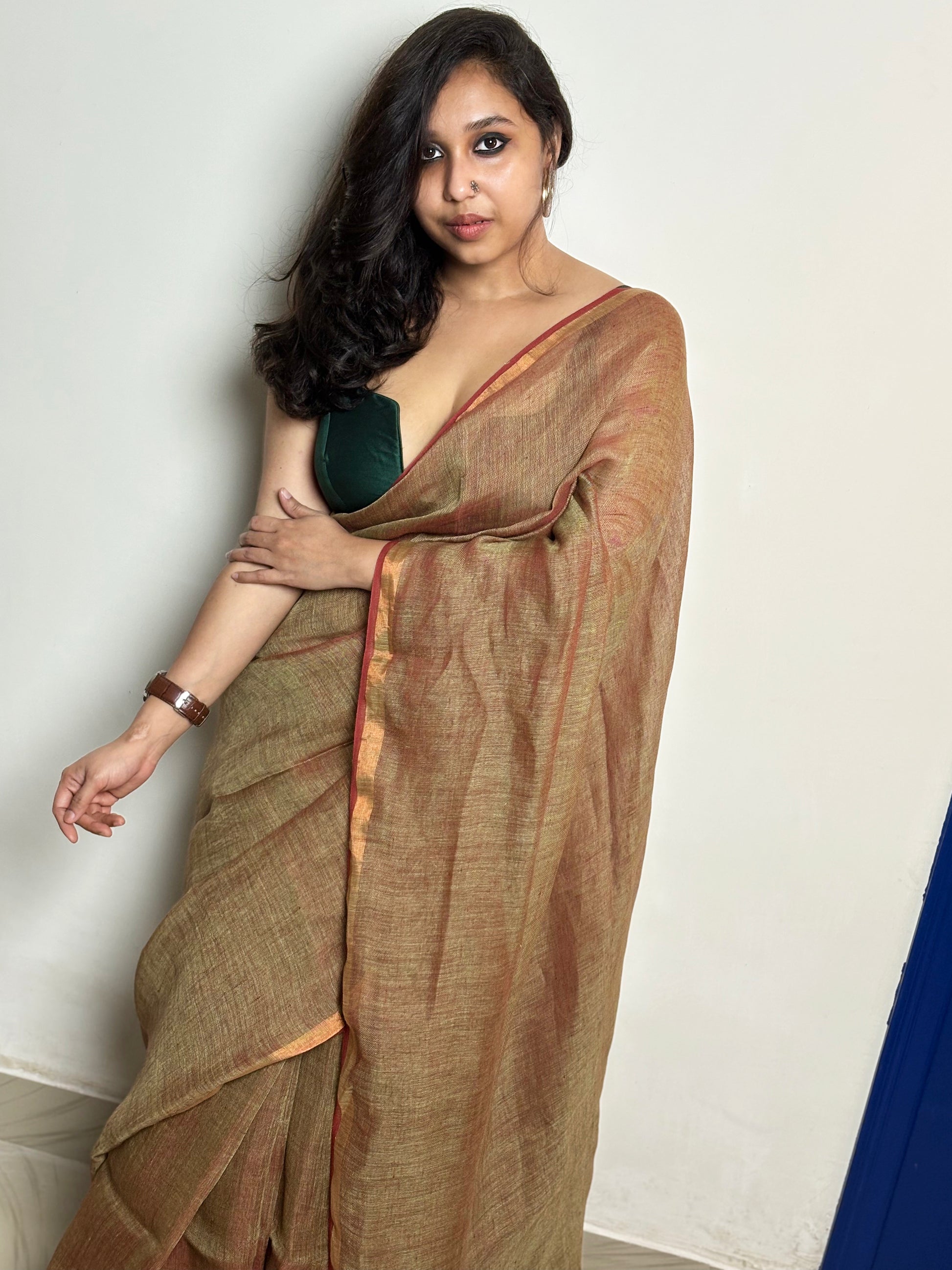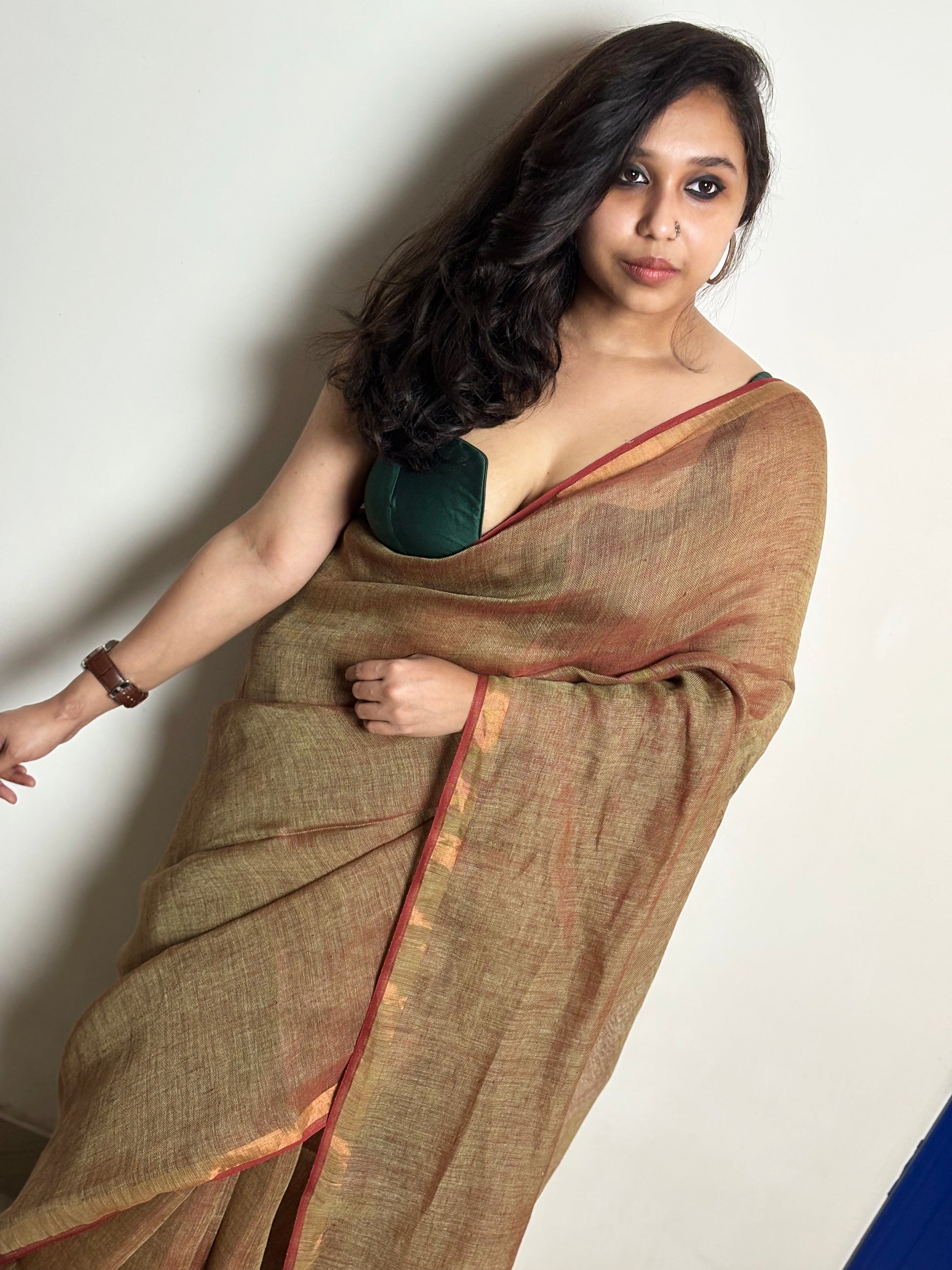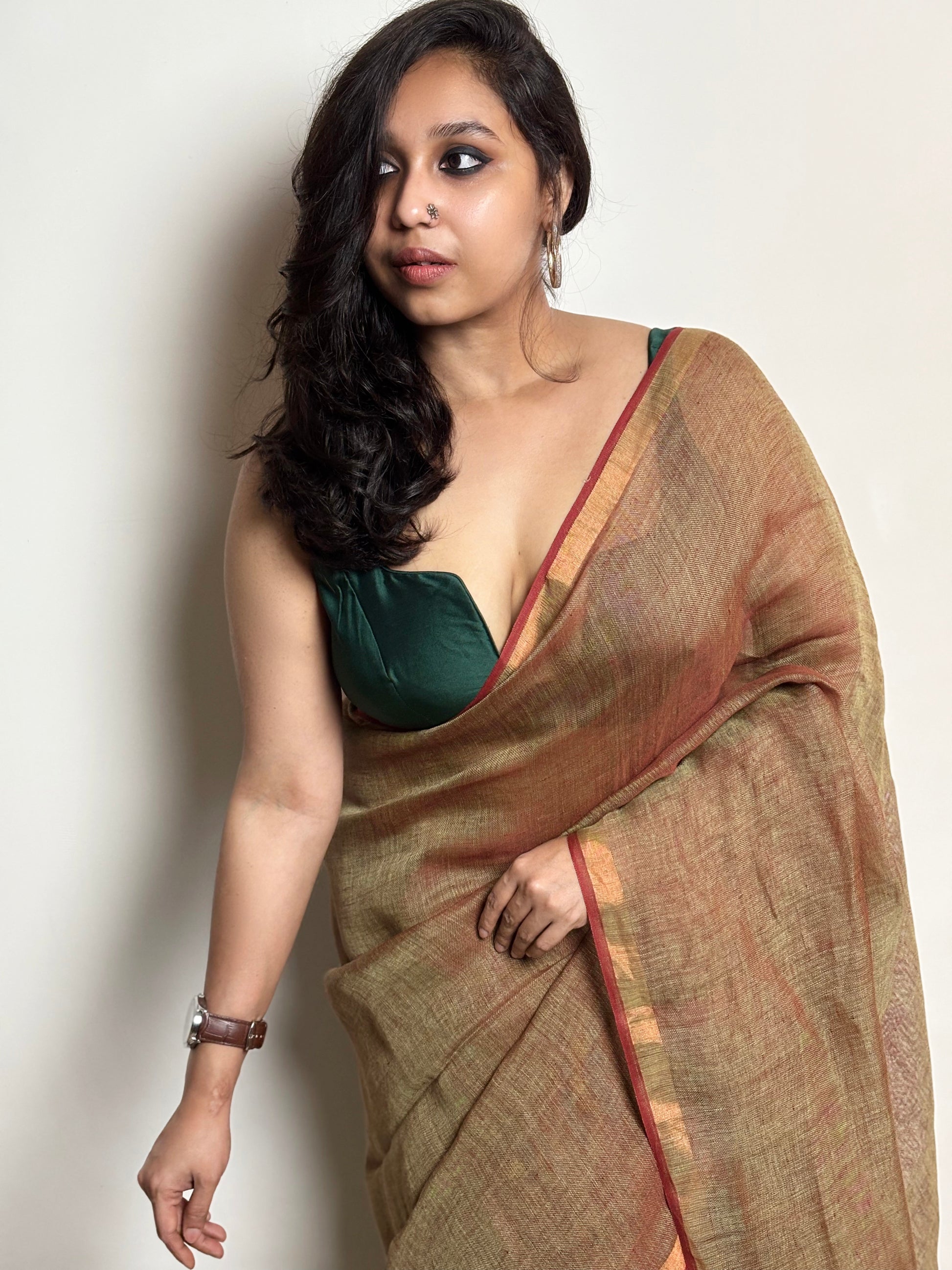 The Lady of the Night” is not merely a saree range; it’s an audacious declaration of style and sensuality. Woven in pure linen by linen, each drape is an exclusive canvas of dual-tone brilliance — a feat once thought unthinkable in linen artistry. But this isn’t a simple two-toned weave; every thread is laid out in an ikat-inspired dance, creating a shimmering play of light and shadow that ignites the glamour of the saree from every angle. The drape flows in a generous length slightly north of 5.5 meters, with an indulgent width of no less than 48 inches, ensuring elegance and drama in every pleat. A gleaming copper zari border frames the artistry, lending a bold edge of luxury. True to its seductive spirit, “The Lady of the Night” comes without a blouse piece — inviting you to pair it daringly, to flaunt your curves, and to own the night.