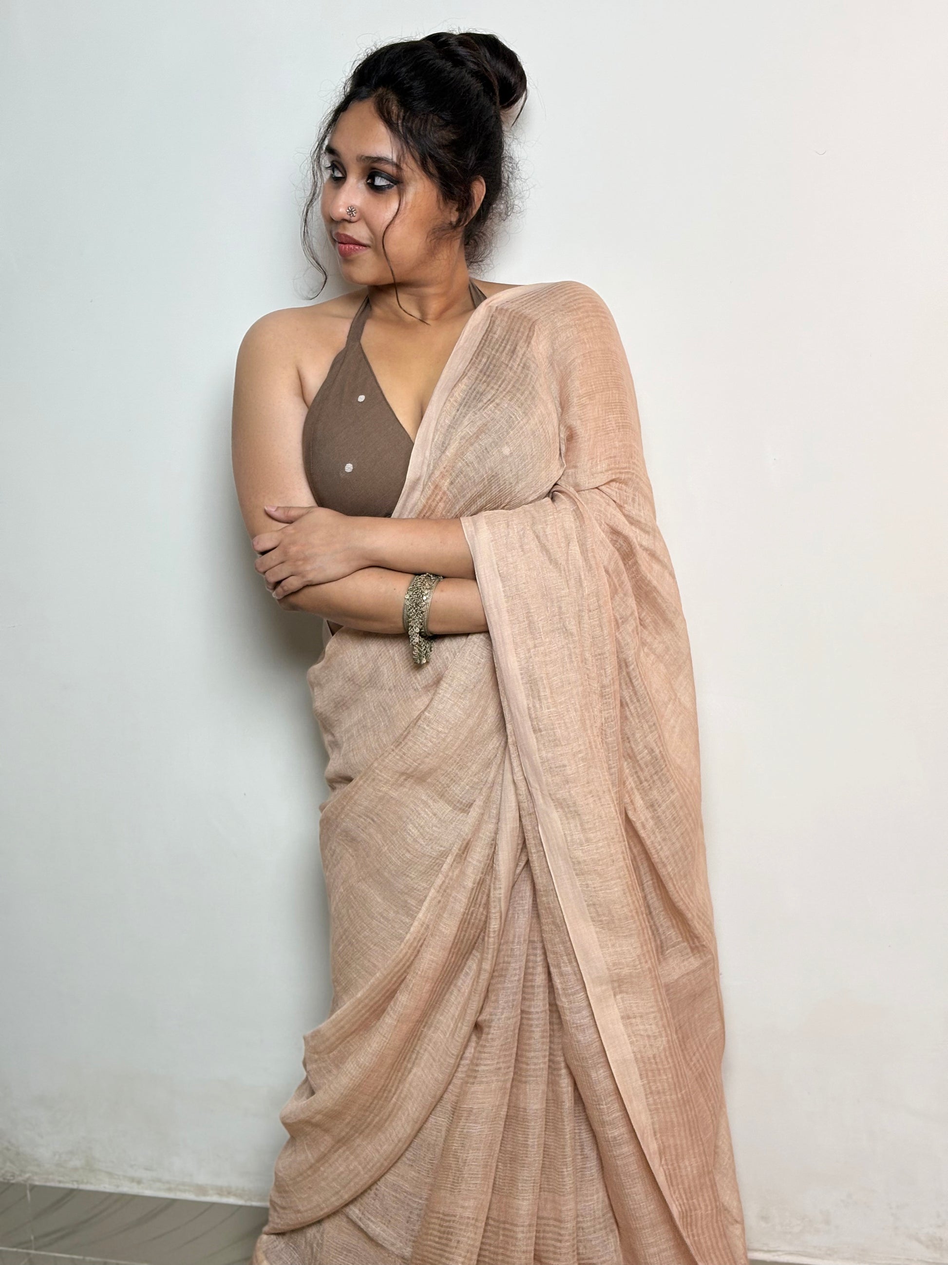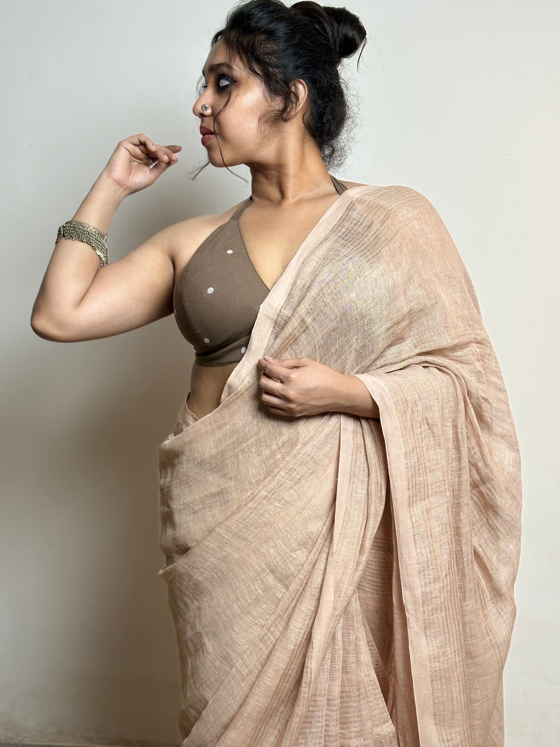 Easy Nude from the Skin collection is the softest whisper of sensuality. A nude-toned linen saree that celebrates the real, untouched beauty of bare skin. It’s a saree that feels like an embrace—gentle, calming, and intimately close to your soul.