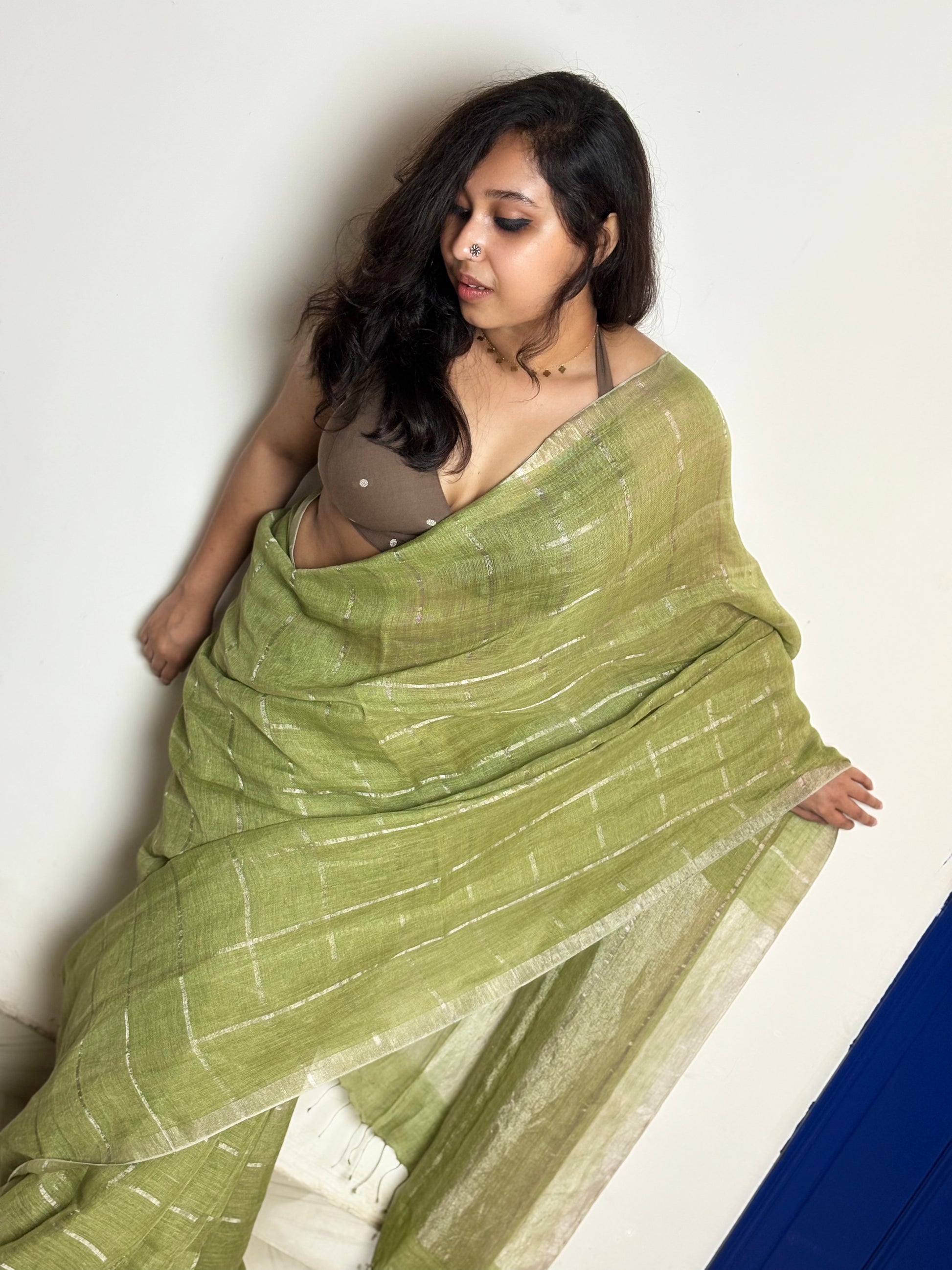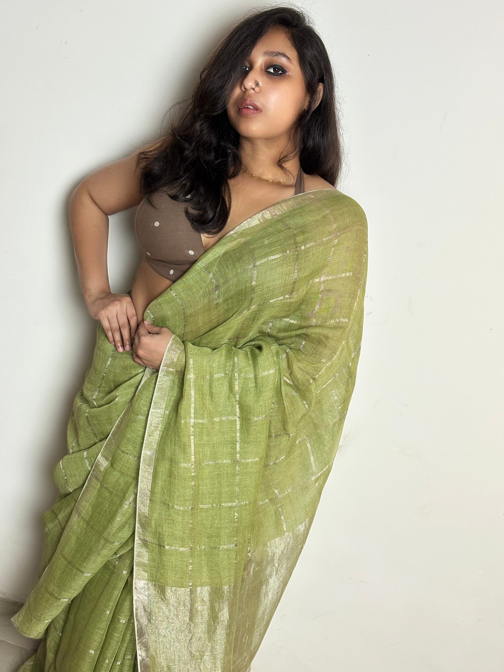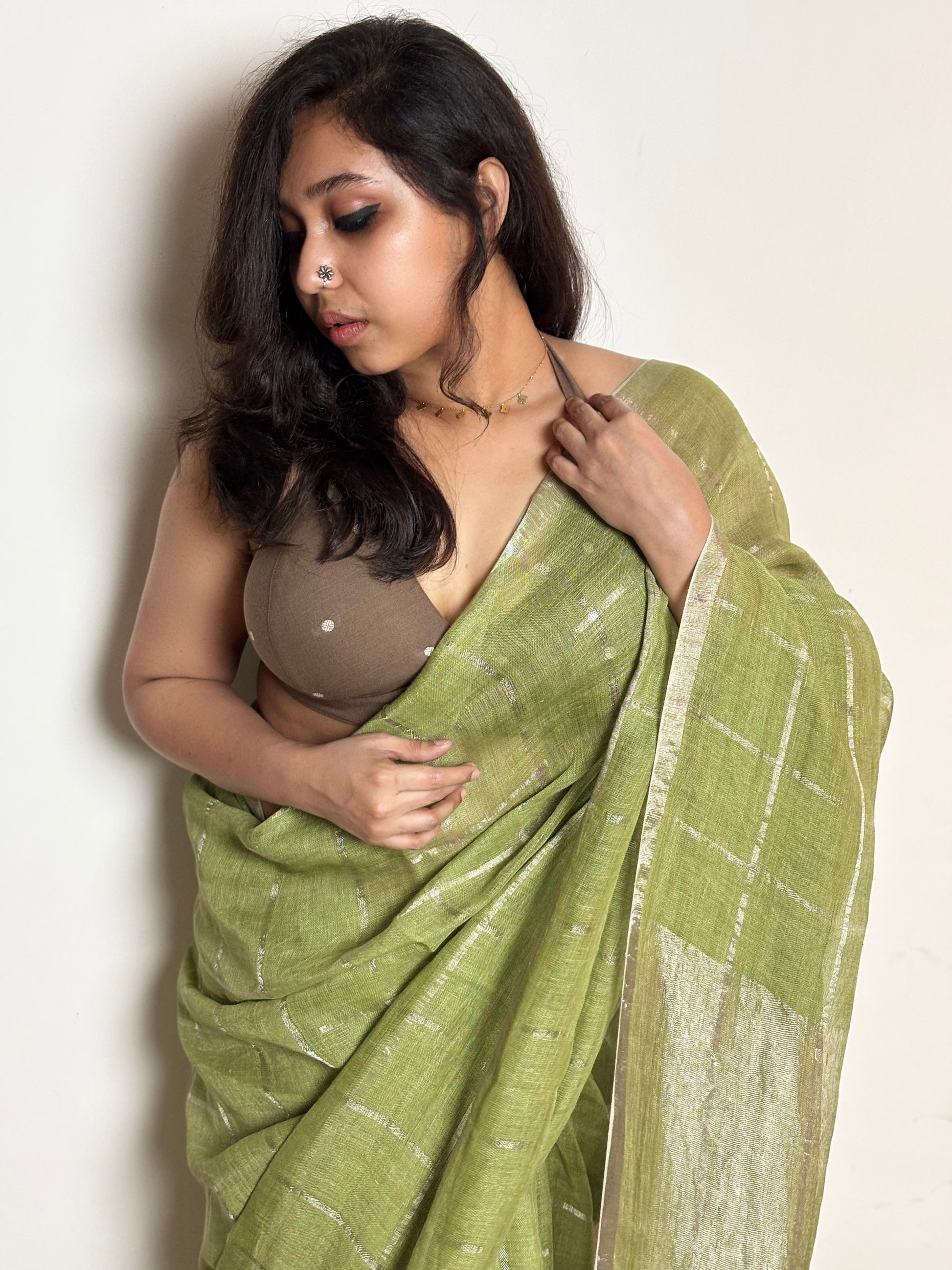 Nairobi in lush green is nature’s lust in a saree—woven in pure linen, caressed with silver zari checks. The saree sways like leaves in wind, gliding around your hips, glimmering against your skin. It’s for the woman who blooms in chaos and thrives in attention.