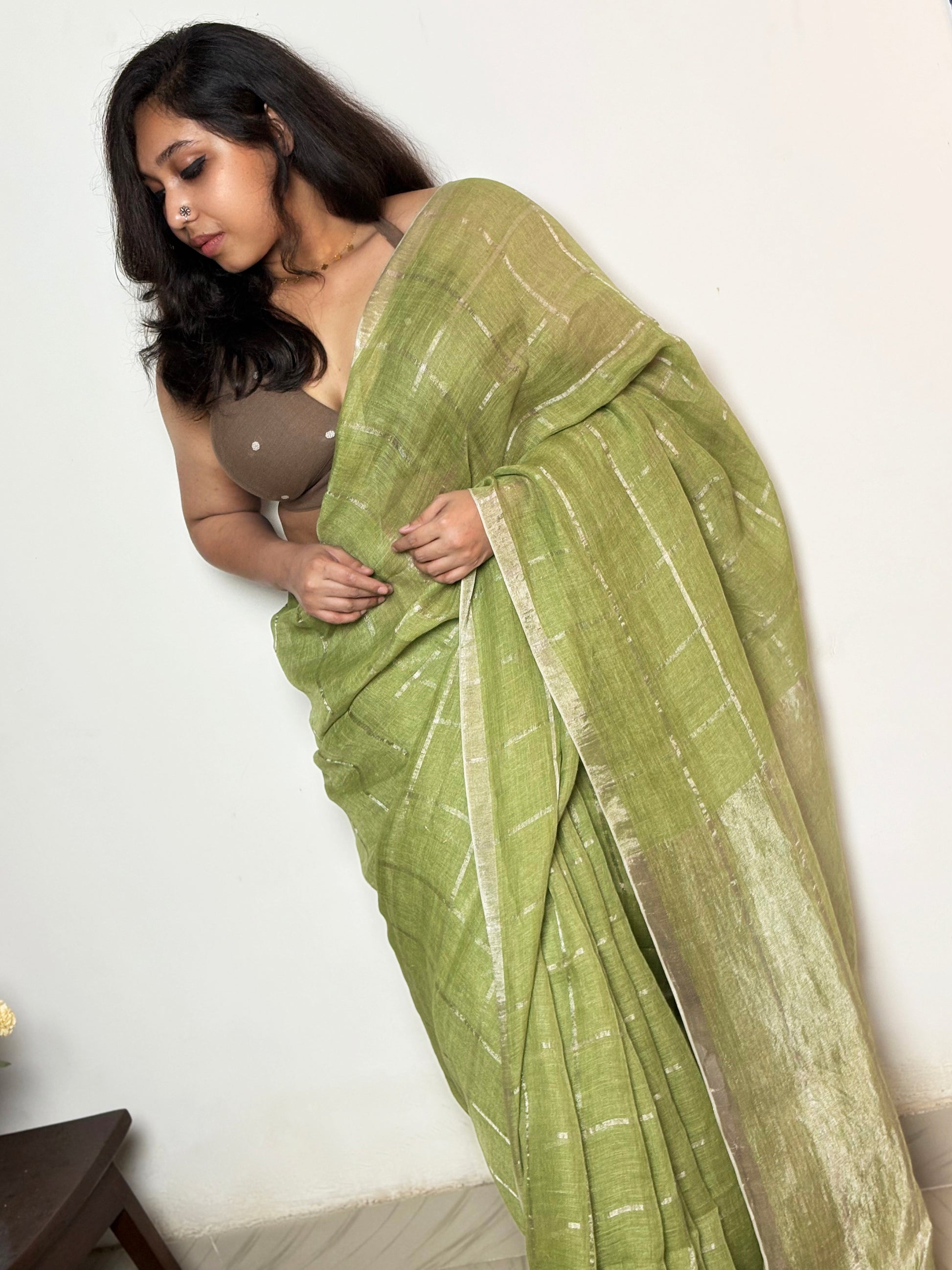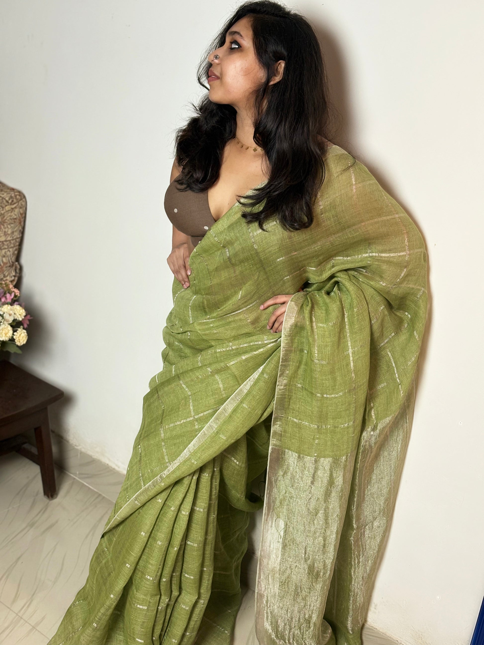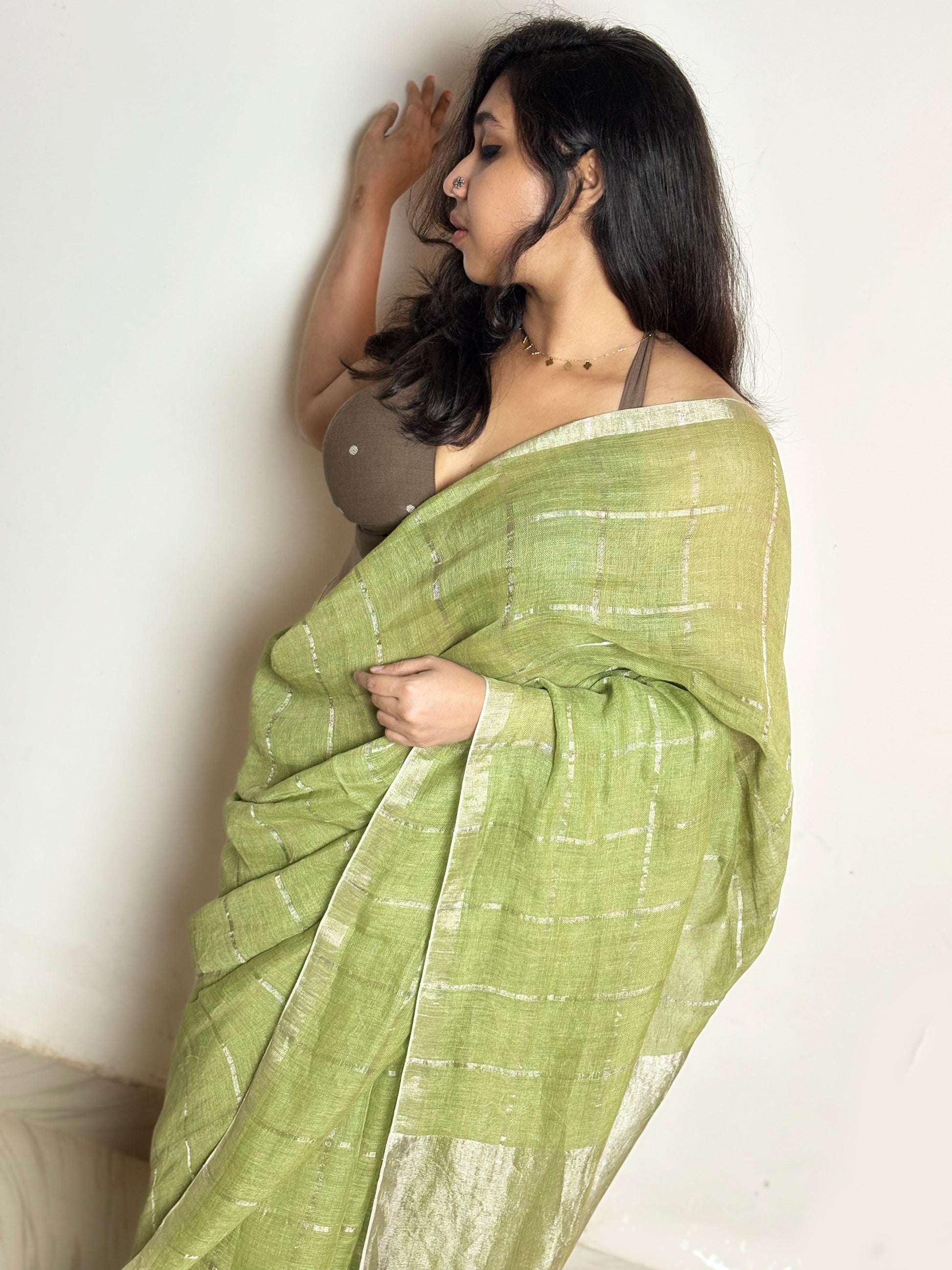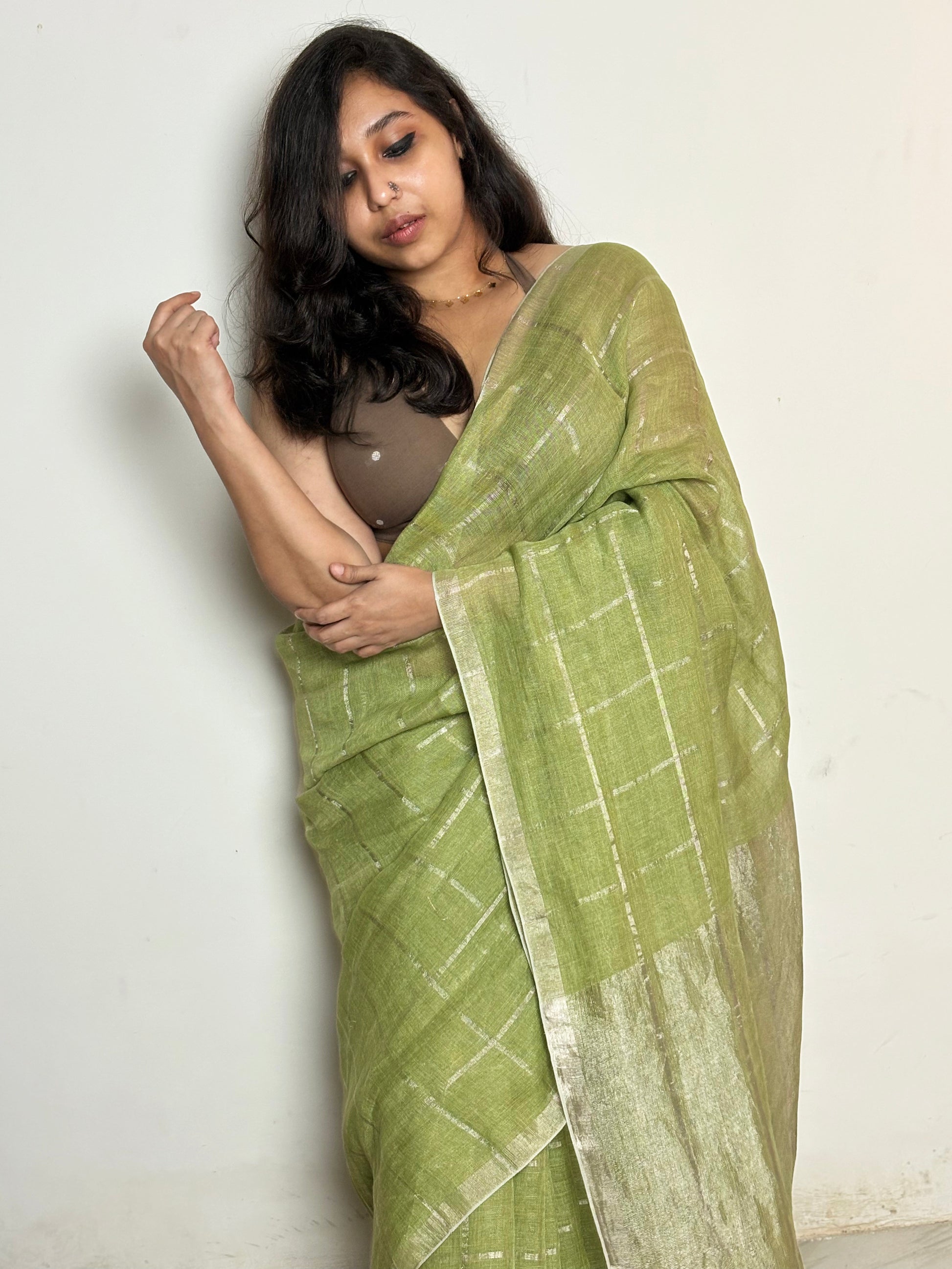 Nairobi in lush green is nature’s lust in a saree—woven in pure linen, caressed with silver zari checks. The saree sways like leaves in wind, gliding around your hips, glimmering against your skin. It’s for the woman who blooms in chaos and thrives in attention.