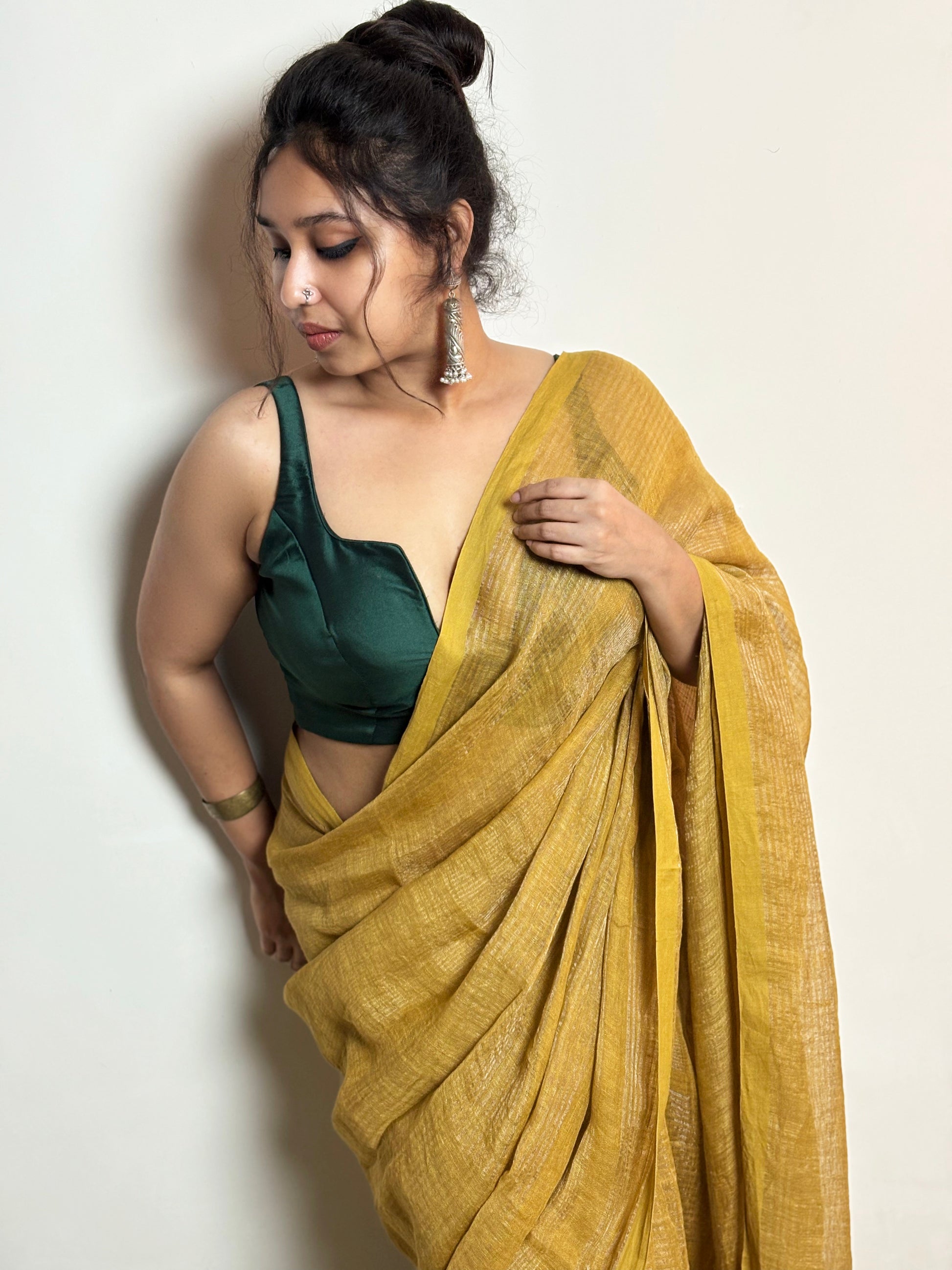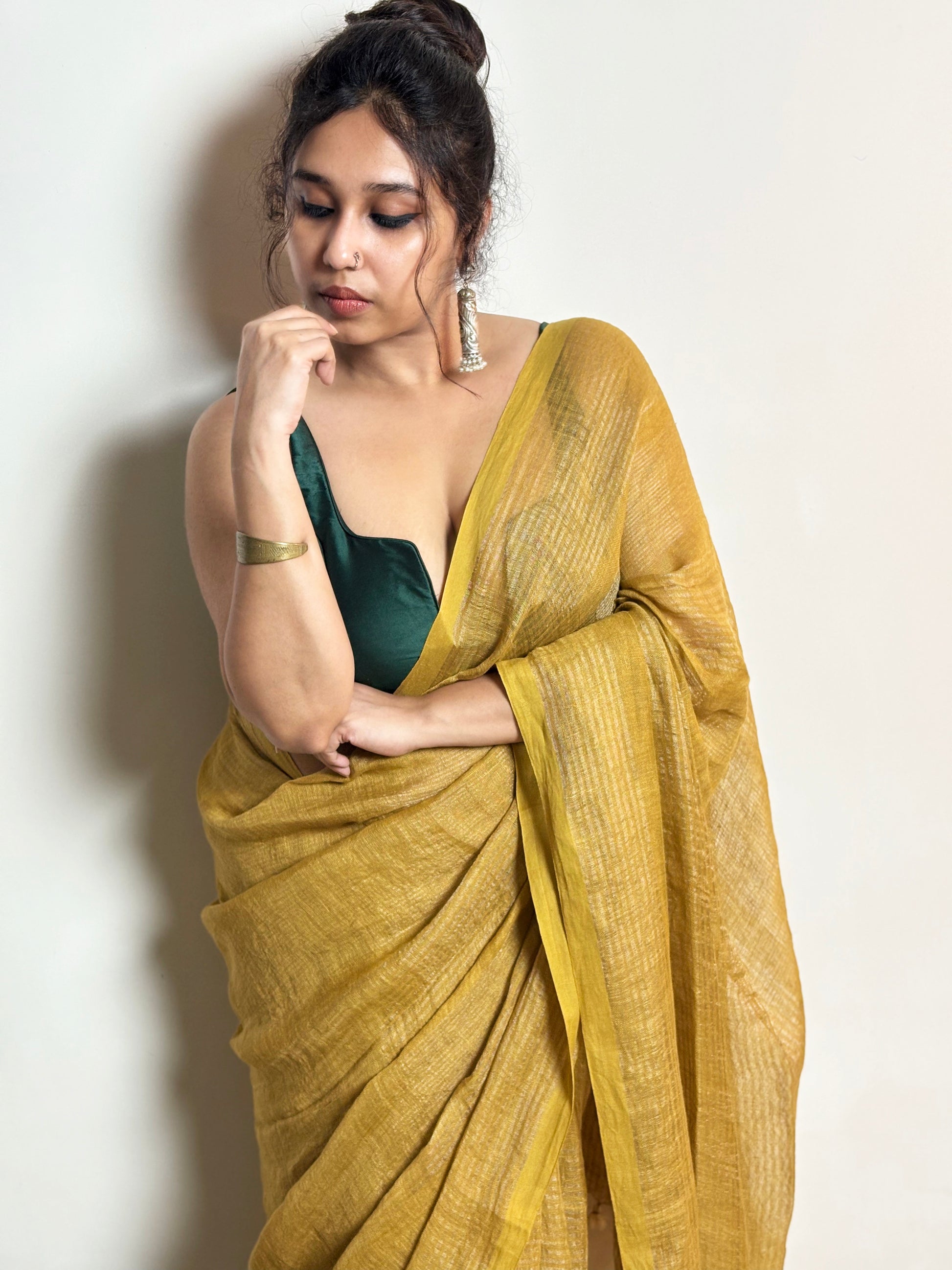 Honey Almond from the Skin series is a golden, glowing celebration of wheatish skin tones—a shade so common in our land, yet so rarely celebrated. This linen saree is dyed in a beautiful yellow ochre, reminiscent of golden hour light kissing your skin. It’s warm, radiant, and unapologetically proud of its roots.