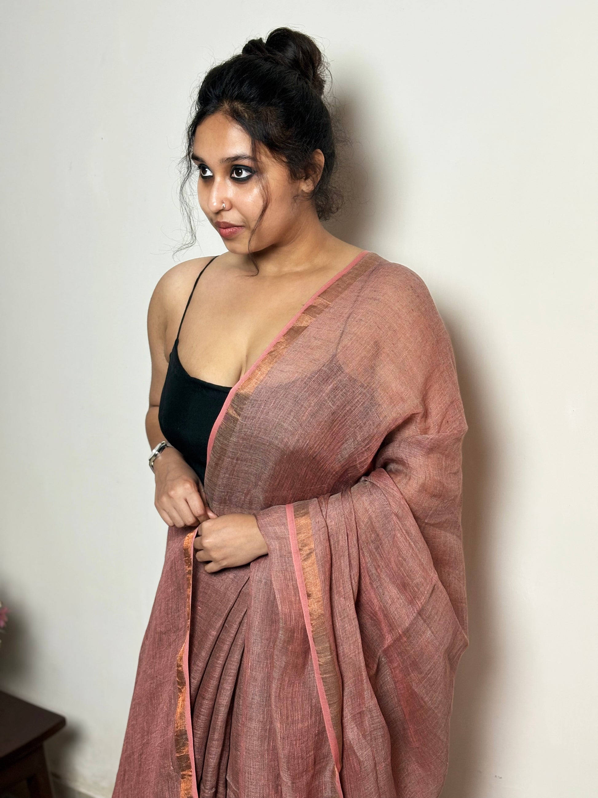 The Lady of the Night” is not merely a saree range; it’s an audacious declaration of style and sensuality. Woven in pure linen by linen, each drape is an exclusive canvas of dual-tone brilliance — a feat once thought unthinkable in linen artistry. But this isn’t a simple two-toned weave; every thread is laid out in an ikat-inspired dance, creating a shimmering play of light and shadow that ignites the glamour of the saree from every angle. The drape flows in a generous length slightly north of 5.5 meters, with an indulgent width of no less than 48 inches, ensuring elegance and drama in every pleat. A gleaming copper zari border frames the artistry, lending a bold edge of luxury. True to its seductive spirit, “The Lady of the Night” comes without a blouse piece — inviting you to pair it daringly, to flaunt your curves, and to own the night.