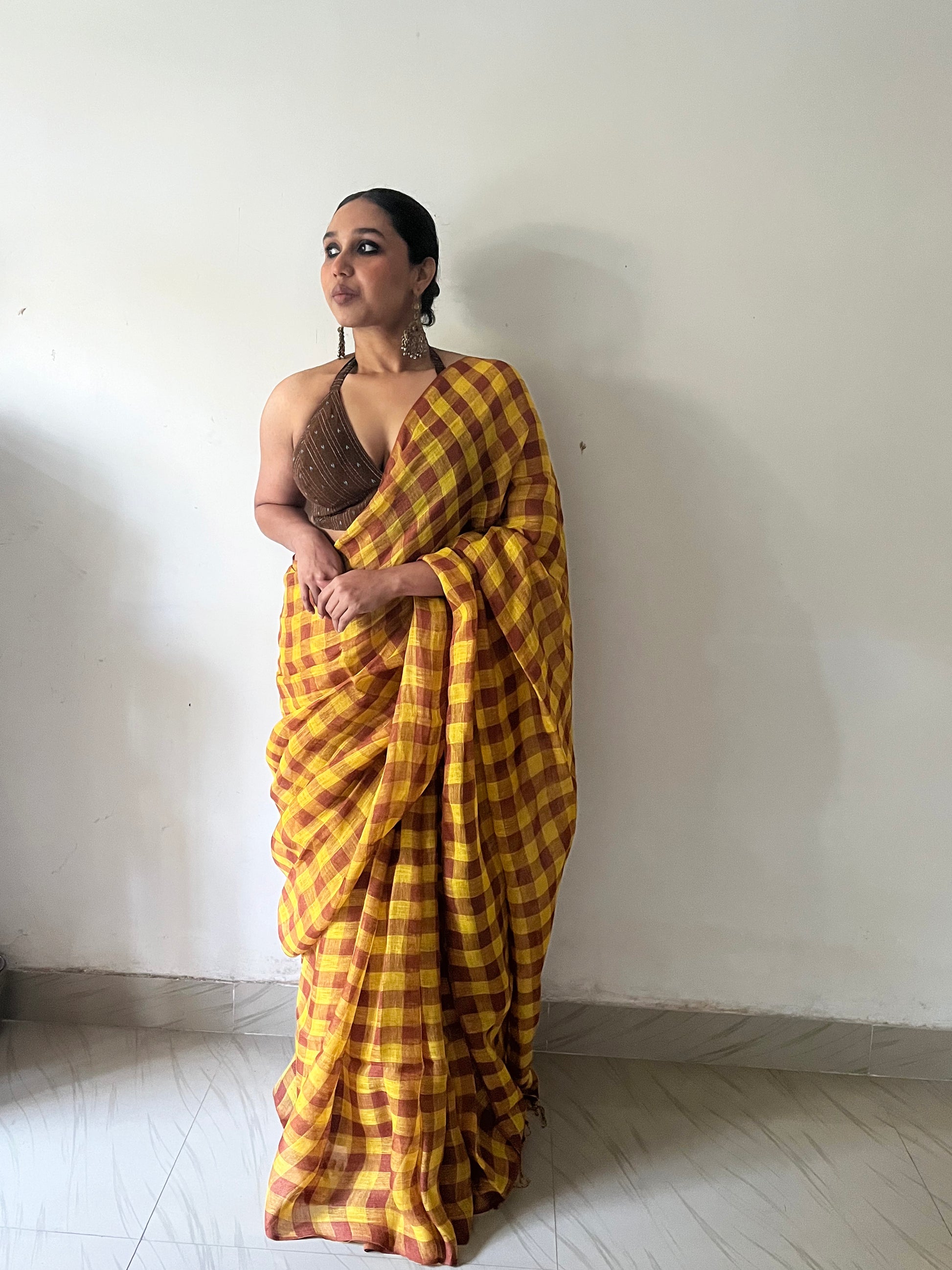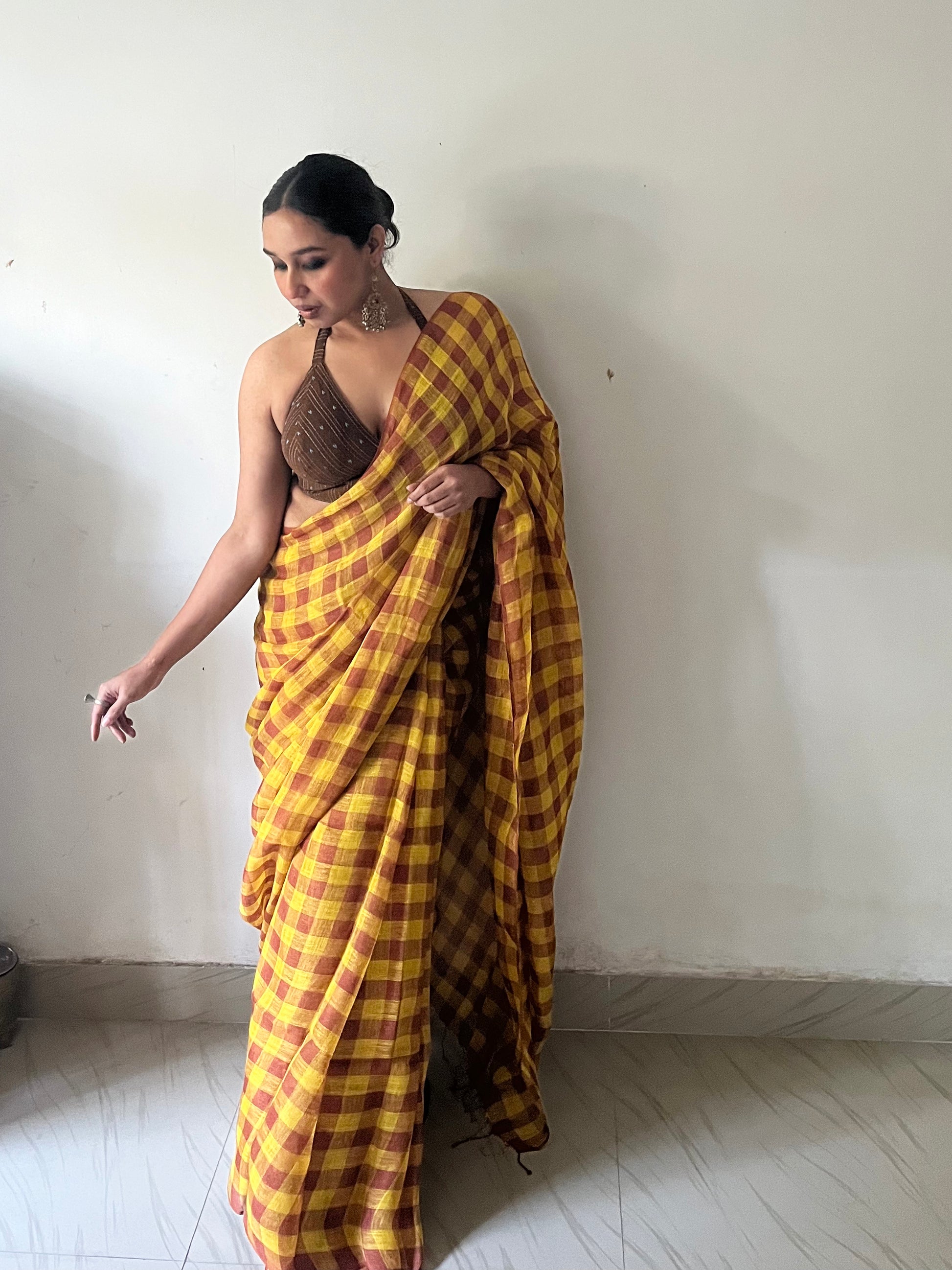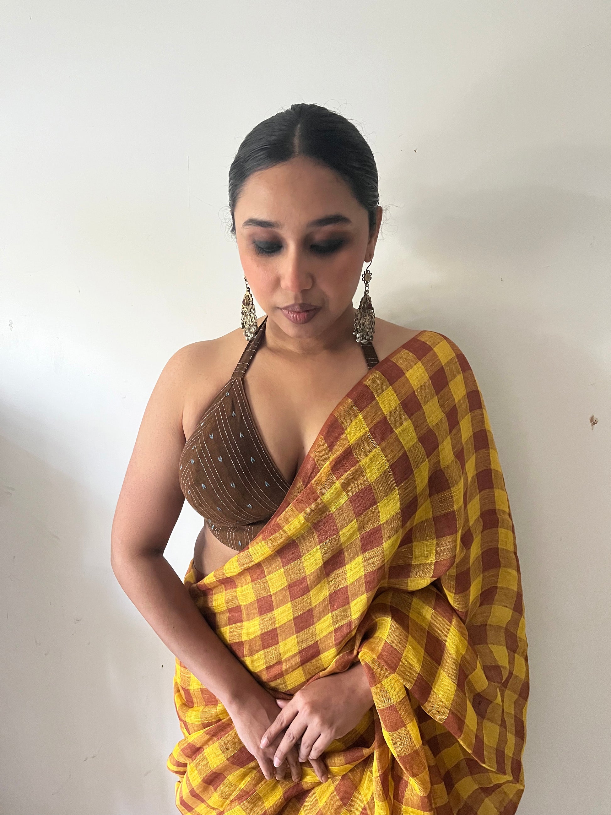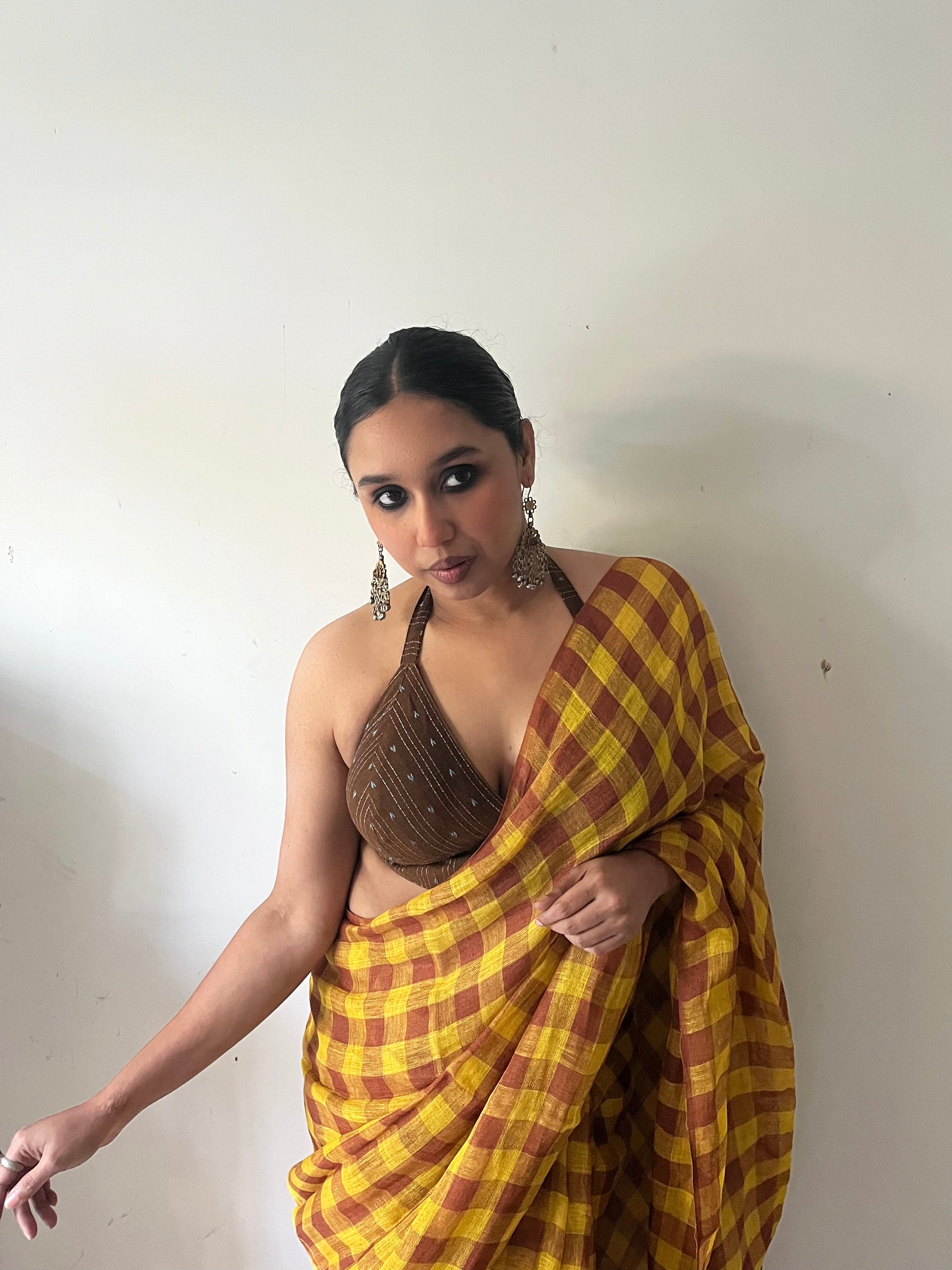 The linen quality ensures that the saree holds its structure while flowing with the body — creating a powerful drape that flatters without excess. This is statement dressing for women who prefer strength over sparkle.