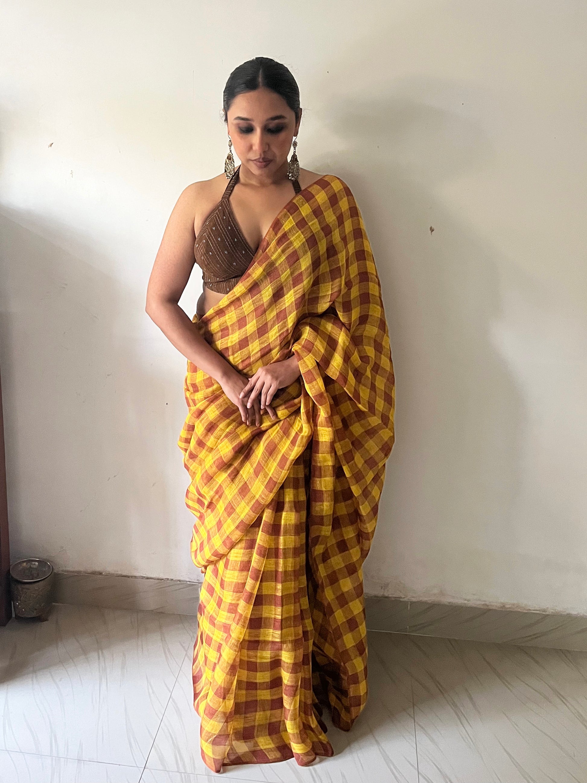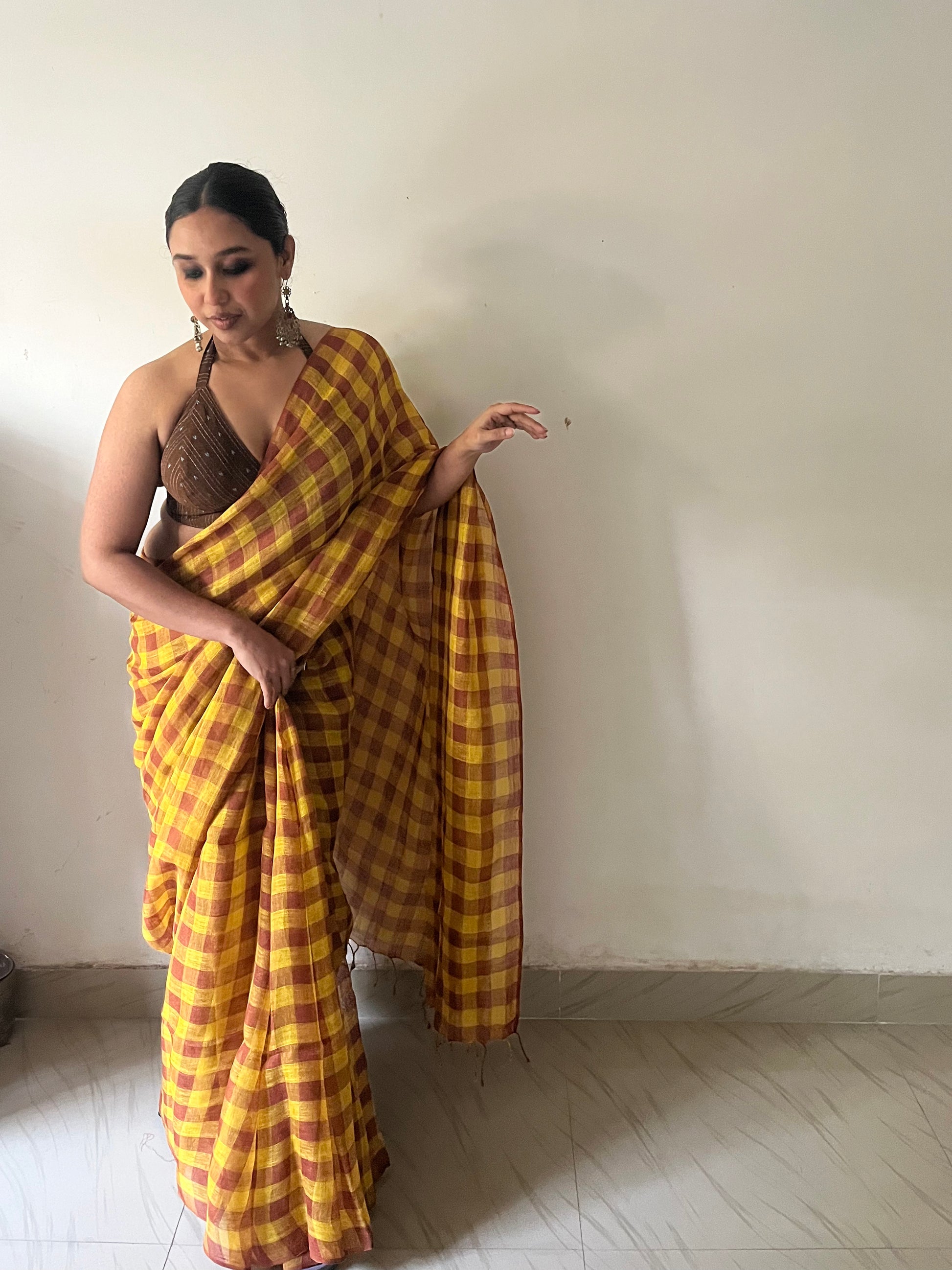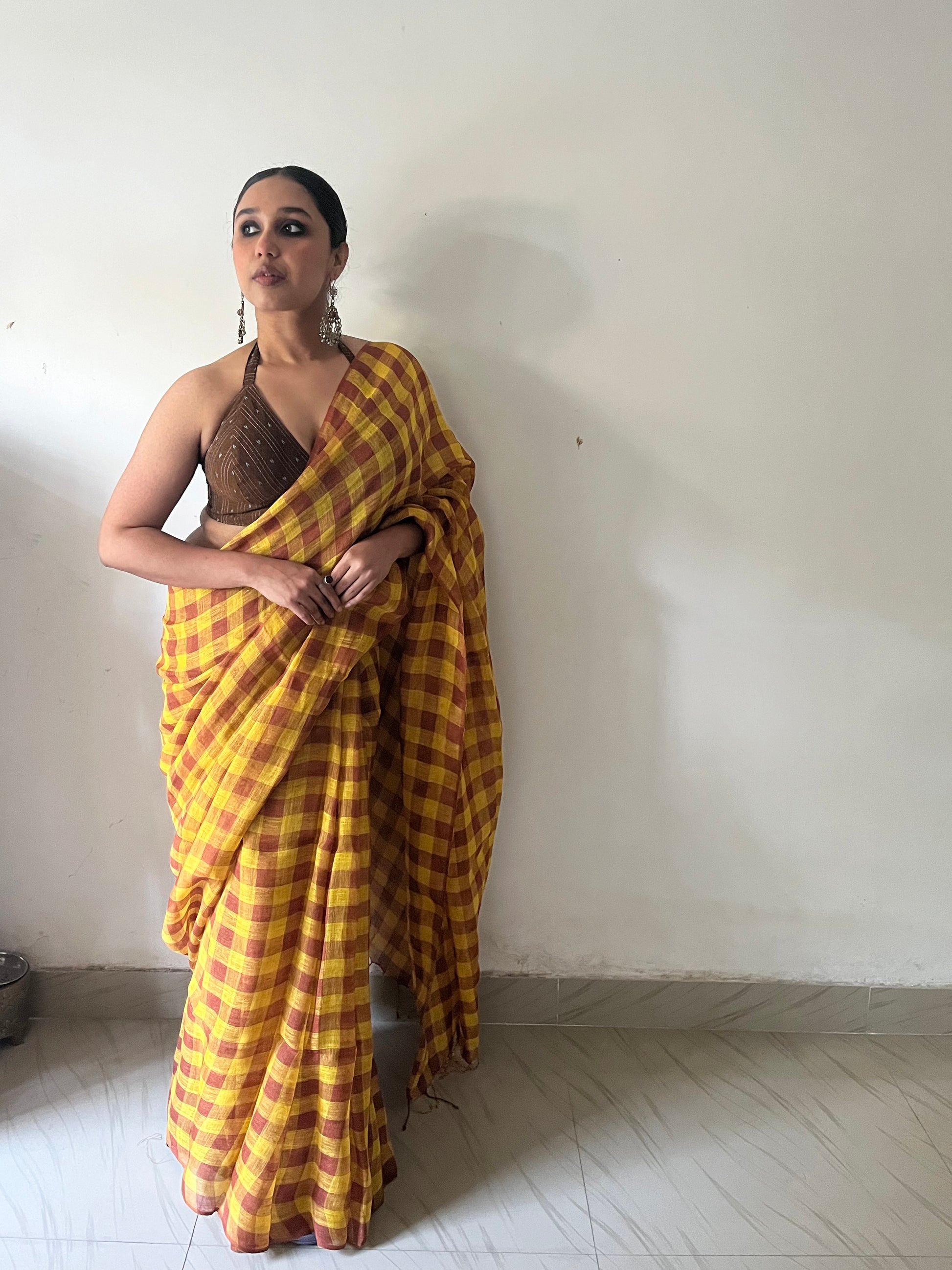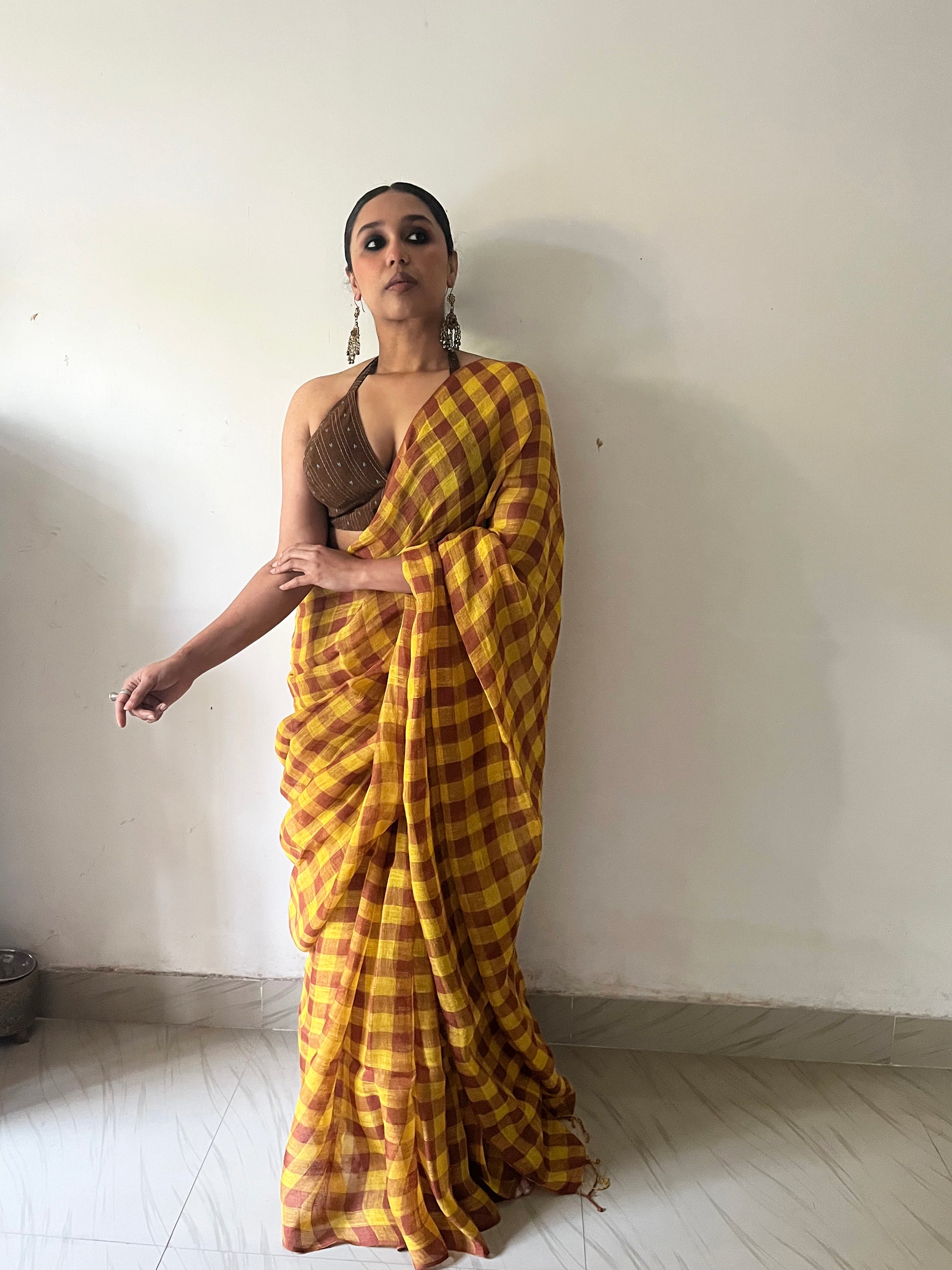The linen quality ensures that the saree holds its structure while flowing with the body — creating a powerful drape that flatters without excess. This is statement dressing for women who prefer strength over sparkle.