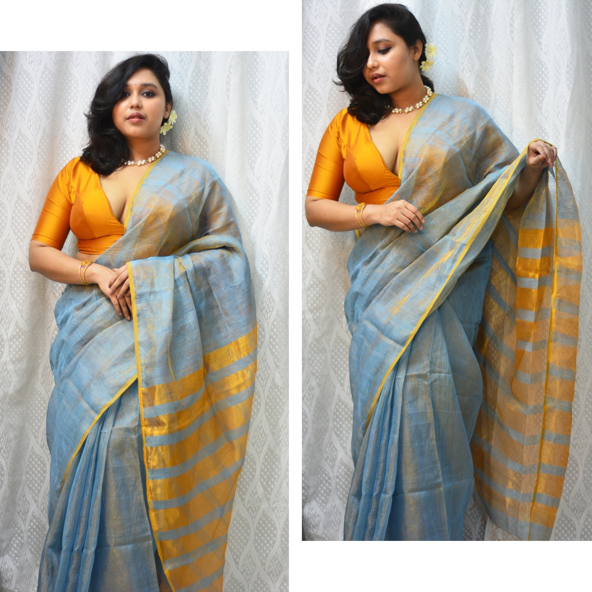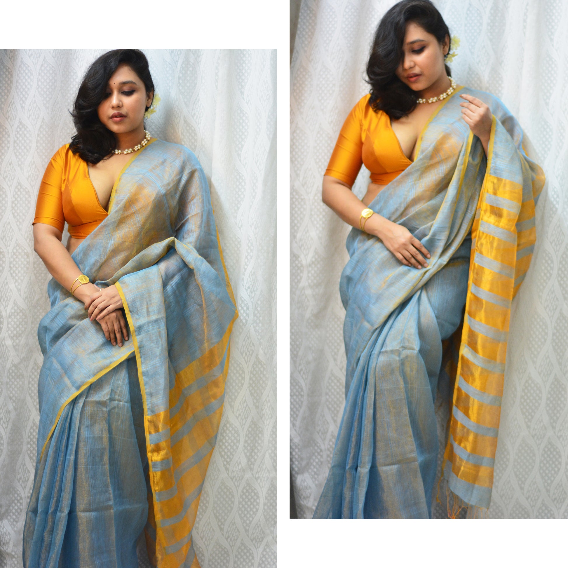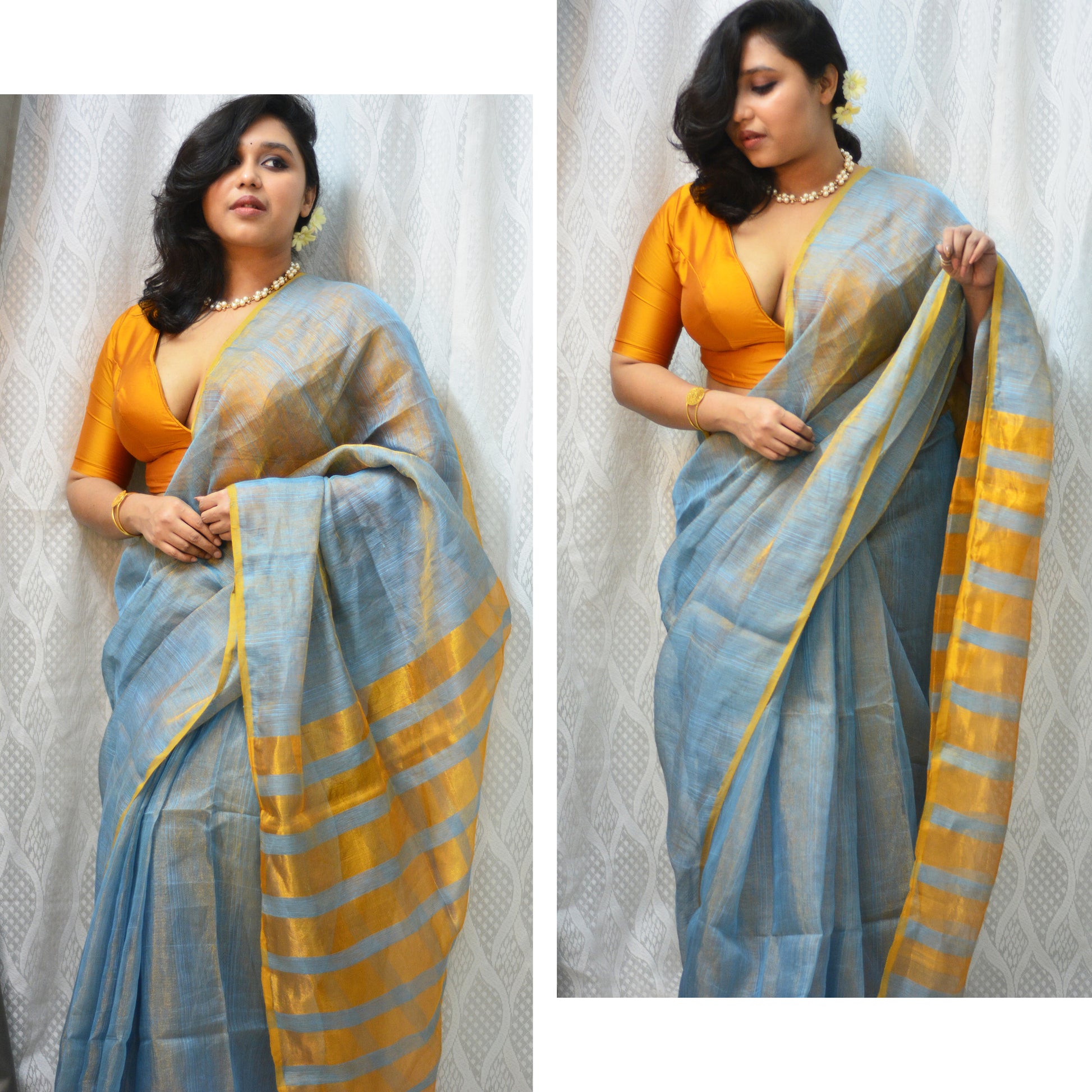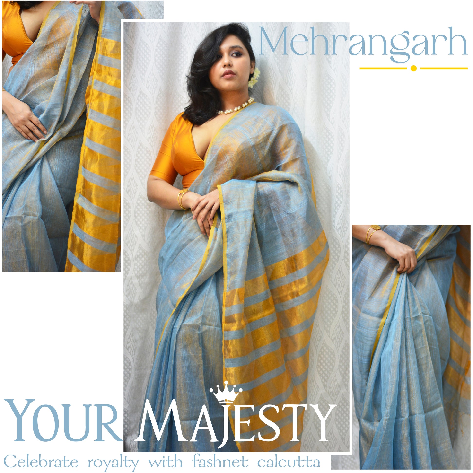 The Queen of Mehrangarh is drenched in the cold, commanding blue of stone fortresses under moonlight. A colour that carries secrets, strategy, and seduction. Woven on a radiant base of pure gold zari, this linen saree is where heritage meets hedonism.