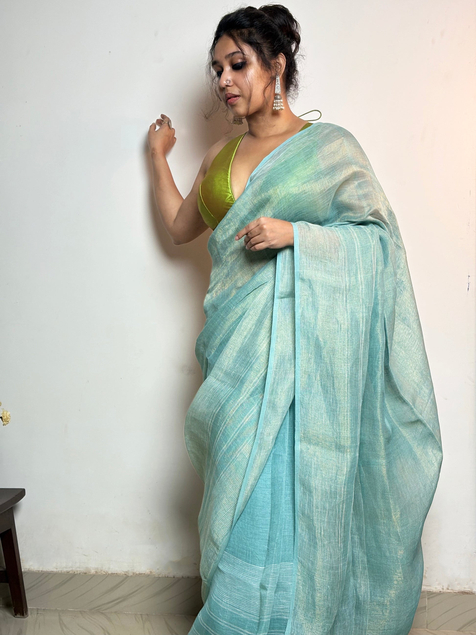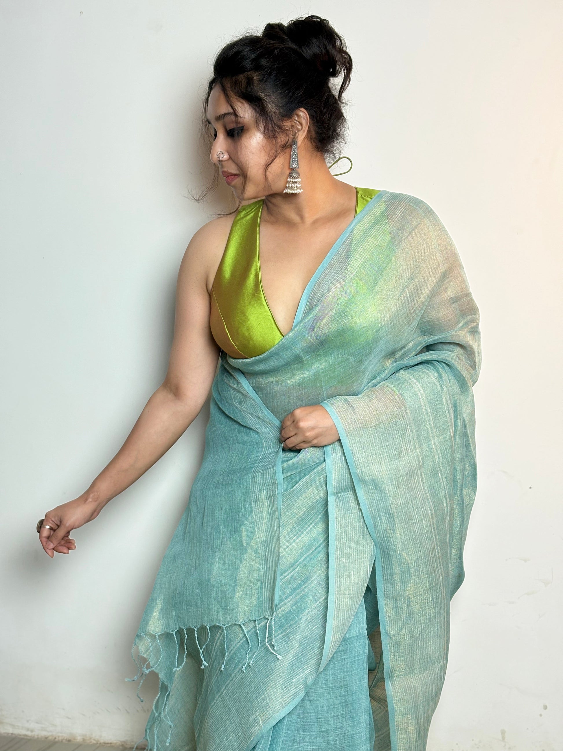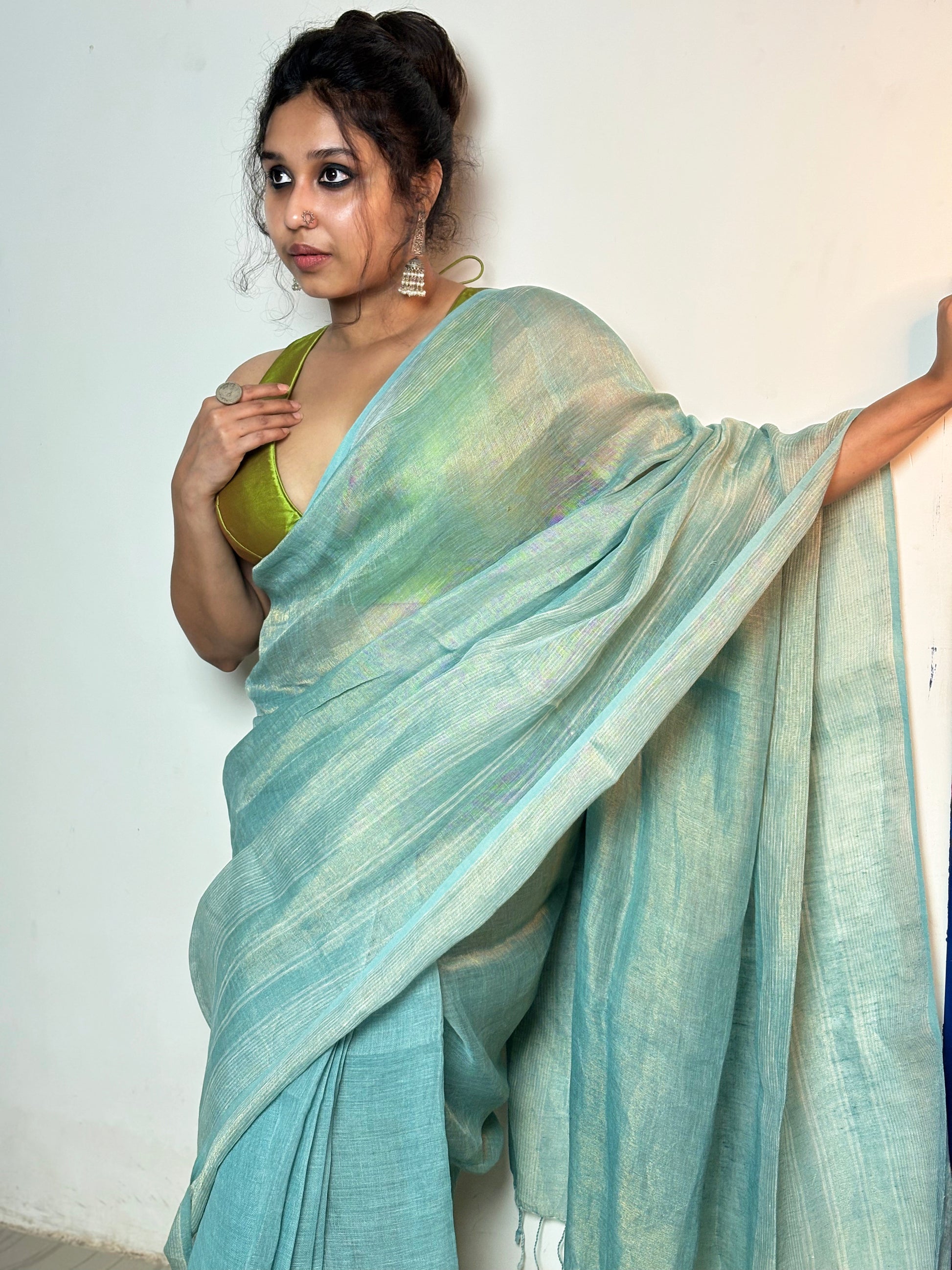 Lightweight linen forms the perfect canvas for the goddess’s story. Two-ply golden zari glimmers across the upper half like sunlight on ocean waves. The white striped border, a mark of Fashnet Calcutta’s quiet innovation, frames the saree like shoreline contours.