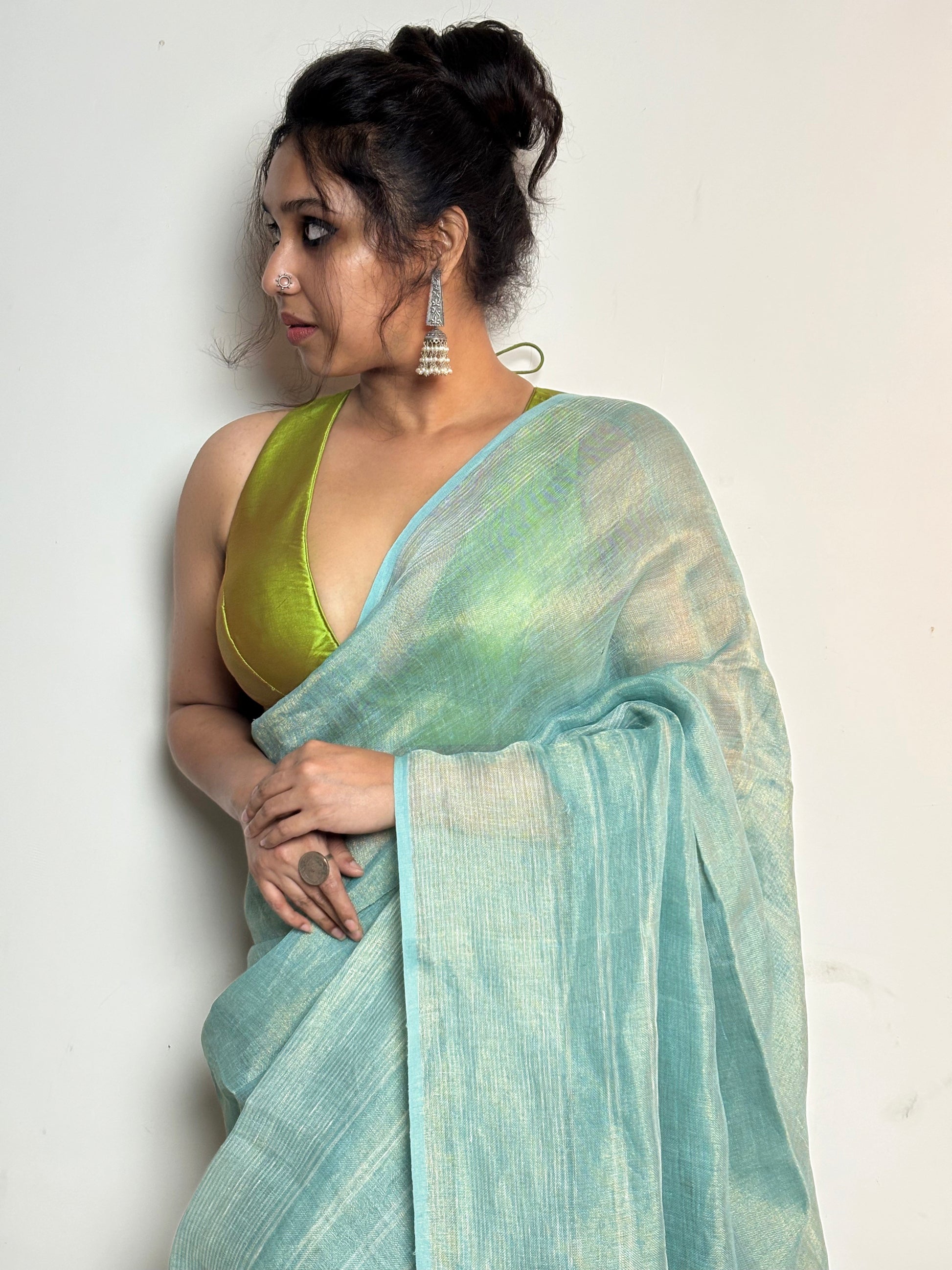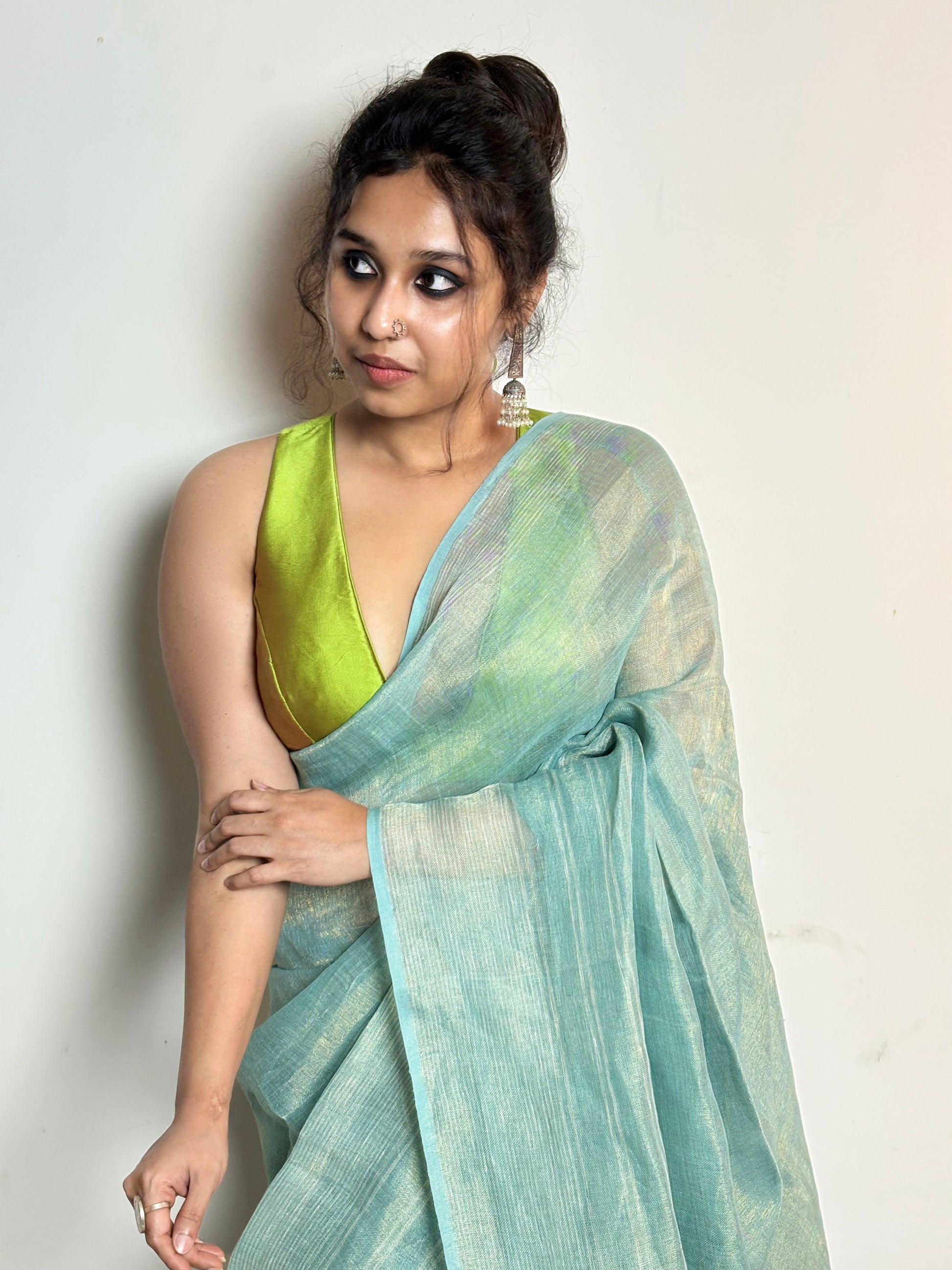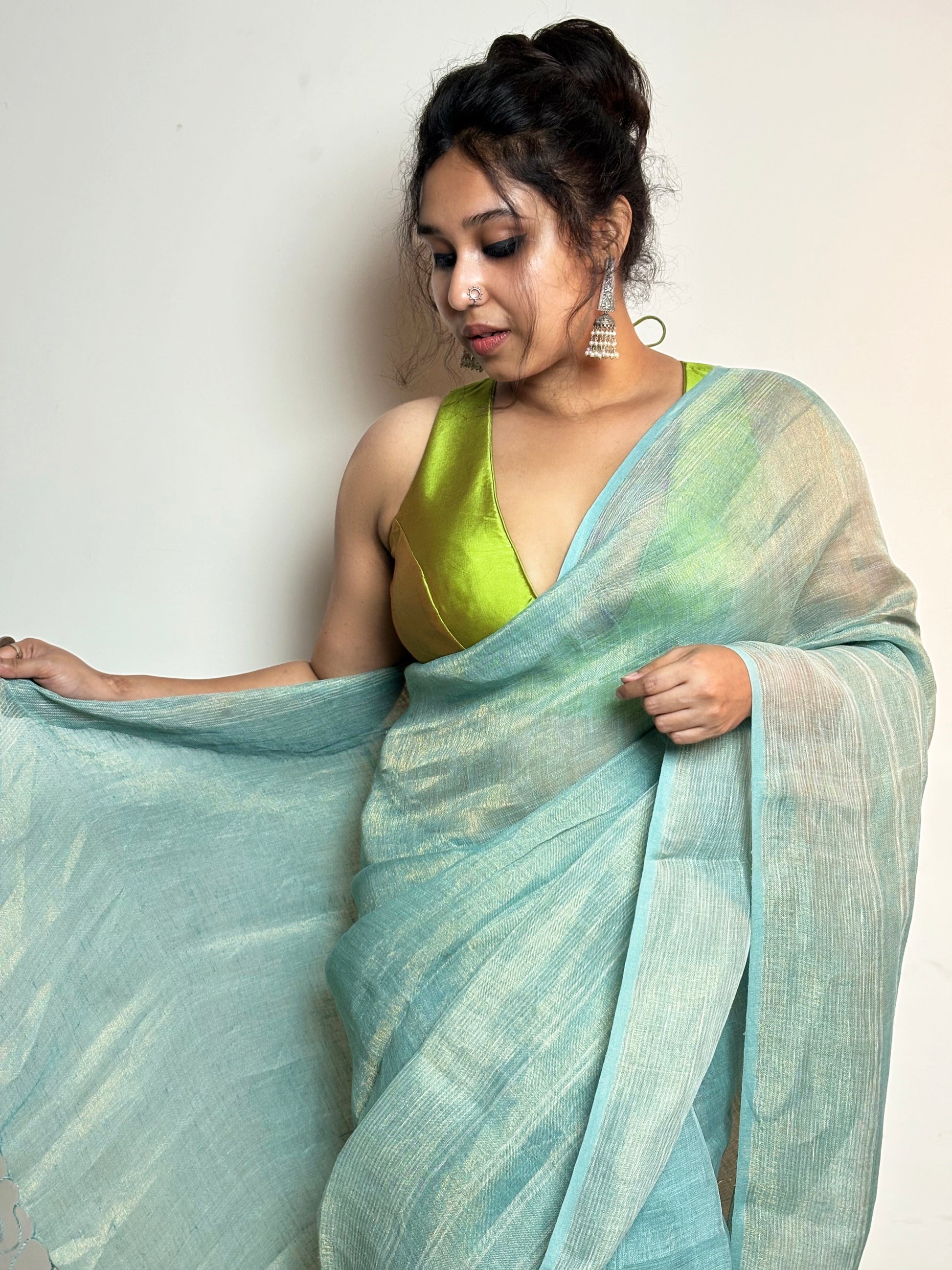 Lightweight linen forms the perfect canvas for the goddess’s story. Two-ply golden zari glimmers across the upper half like sunlight on ocean waves. The white striped border, a mark of Fashnet Calcutta’s quiet innovation, frames the saree like shoreline contours.